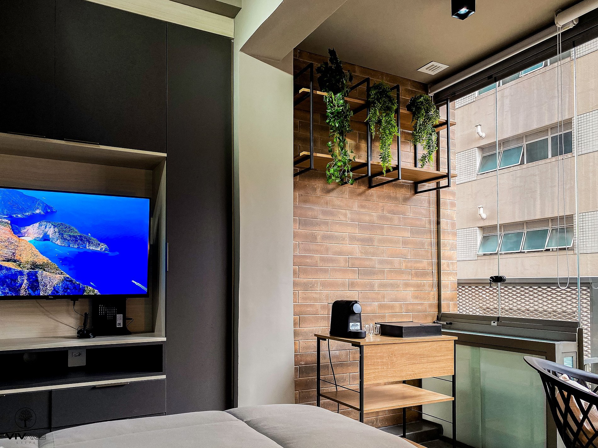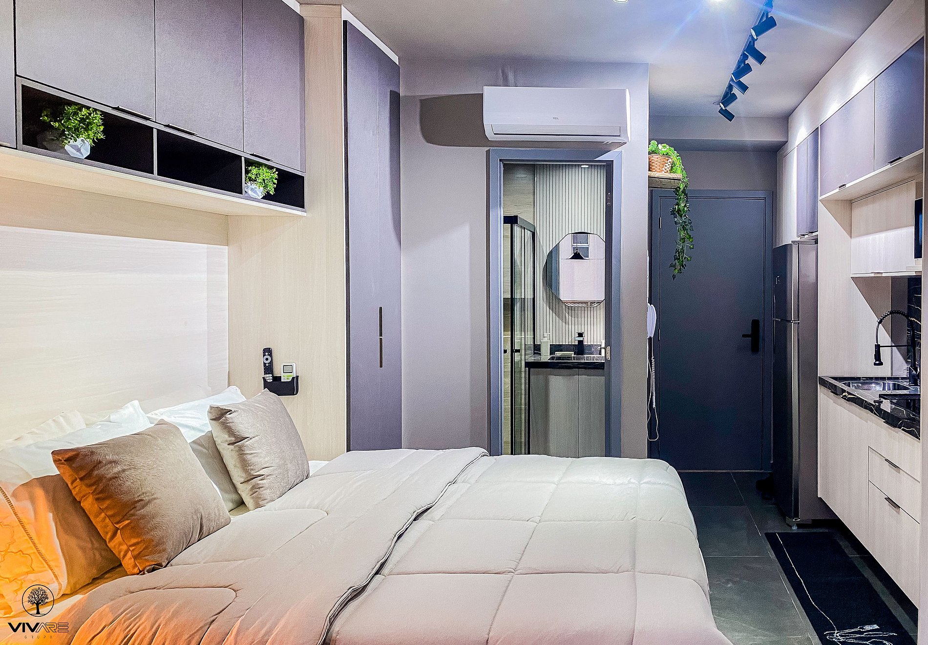 Apartment with a Queen bed, wardrobe with hanger, split air conditioning, and a balcony. Comfortable environment with a 40" Smart TV, 250Mbps Wi-Fi; Kitchen with duplex refrigerator, stove, microwave, coffee maker, blender, sandwich maker, dishes, pots, and water purifier; Bathroom with hot water and soft bath towels.