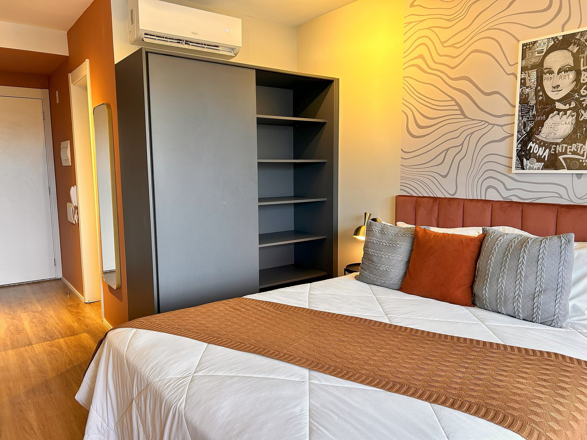 Studio with a double bed, wardrobe with hangers, air conditioning, and blackout curtains.