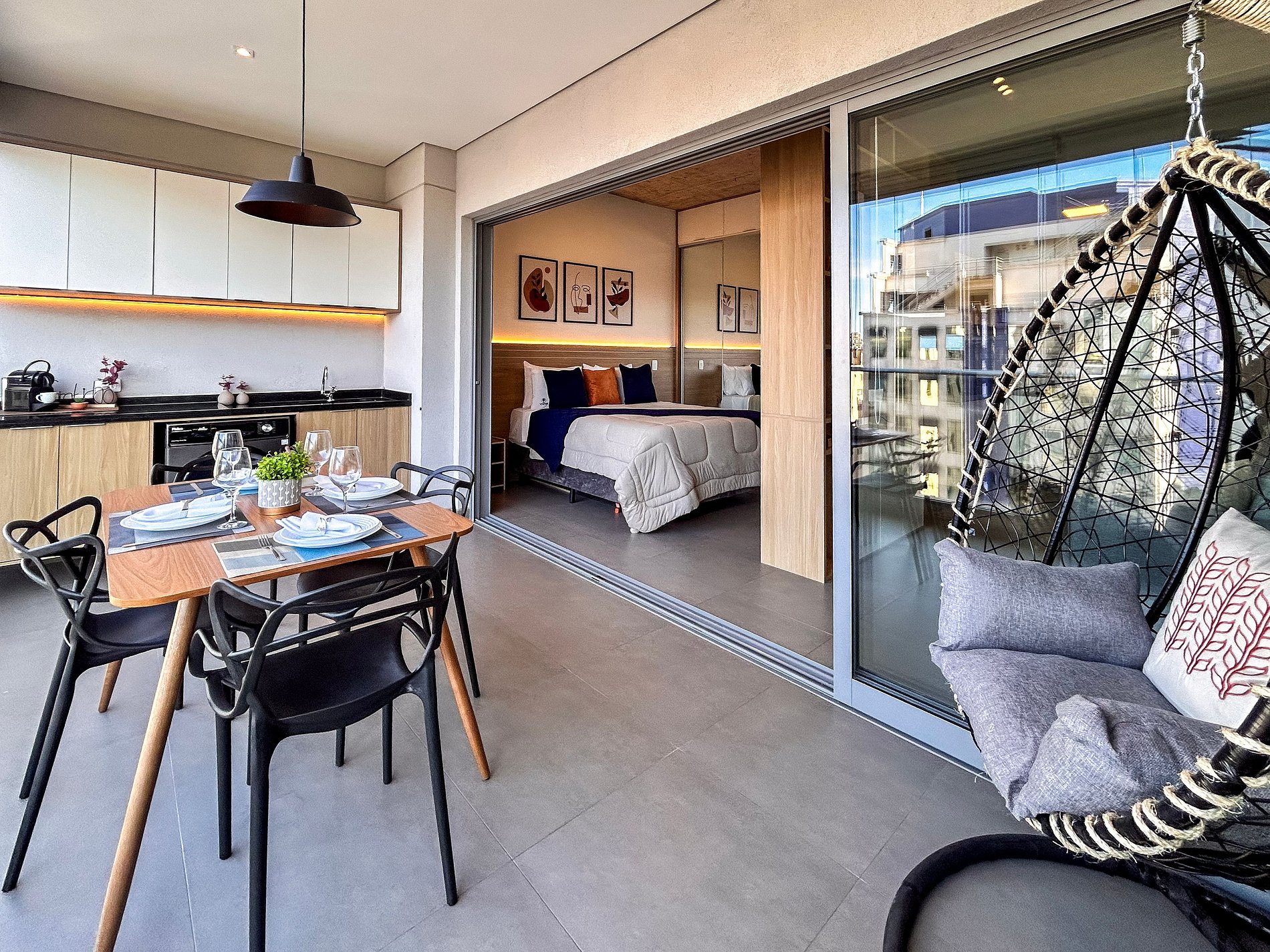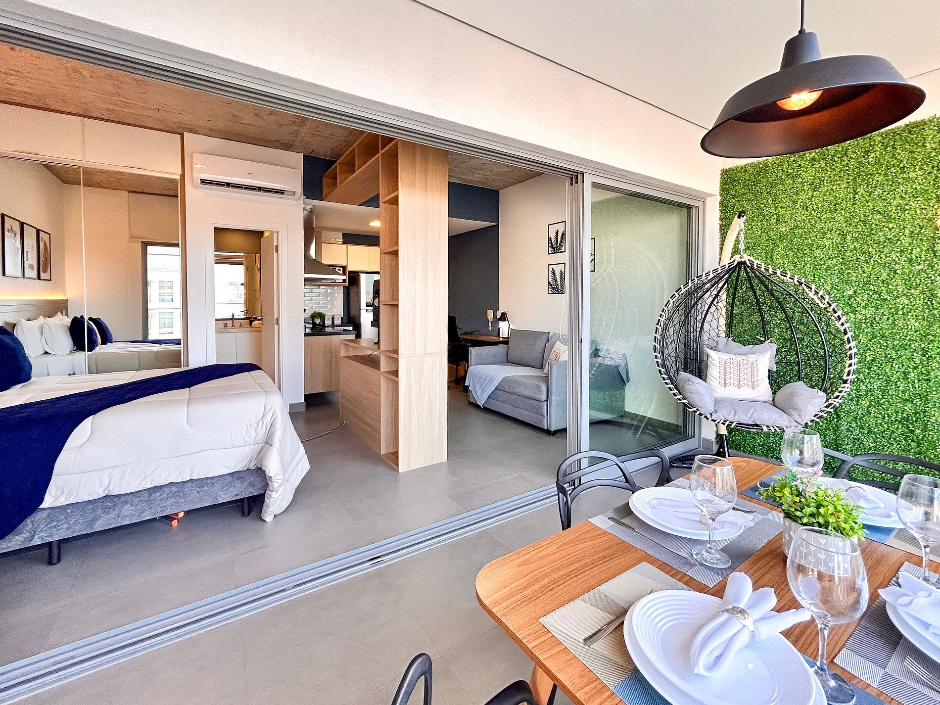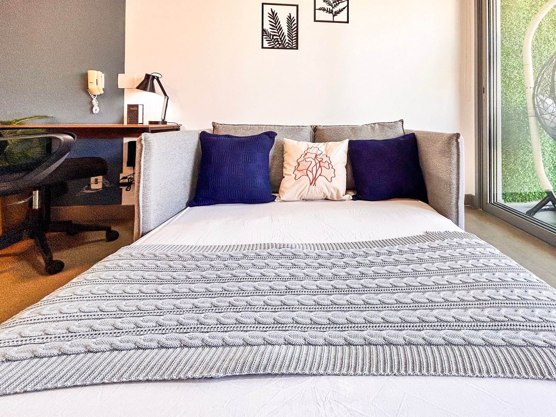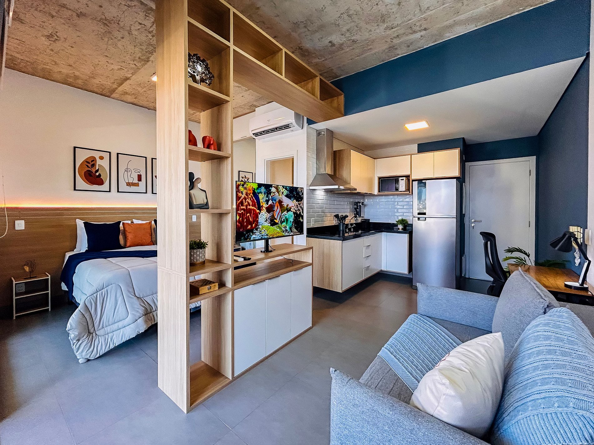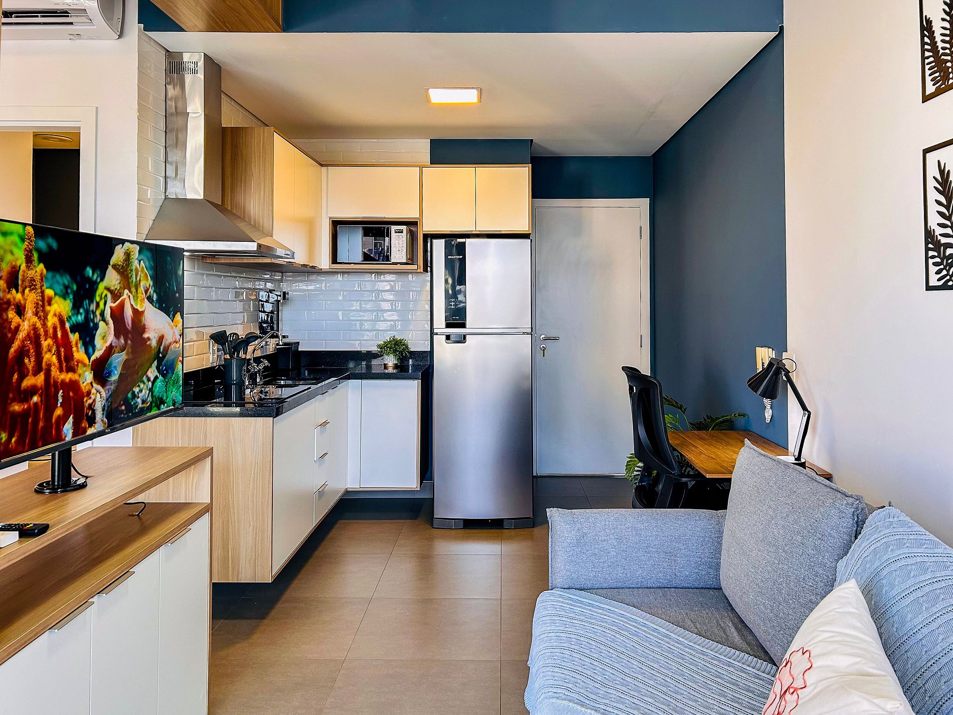 Everything has been thoughtfully designed to provide you with one of the best stays of your life. The studio features a queen-size bed, wardrobe with hangers, split air conditioning, and blackout curtains. Enjoy a cozy space with a 43-inch Smart TV, 300Mbps Wi-Fi, and a double sofa bed. The kitchen is equipped with a duplex refrigerator, stove, microwave, coffee maker, blender, sandwich maker, dishes, and cookware. The bathroom offers hot water and soft bath towels.