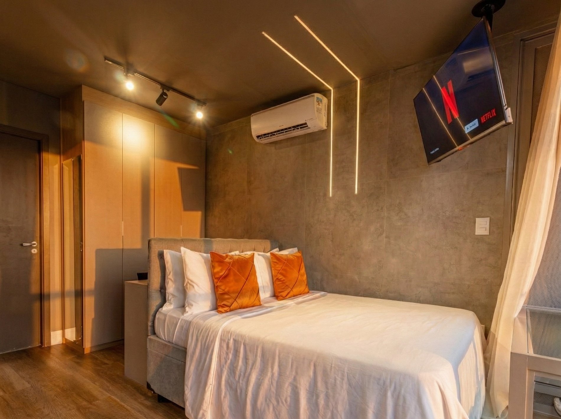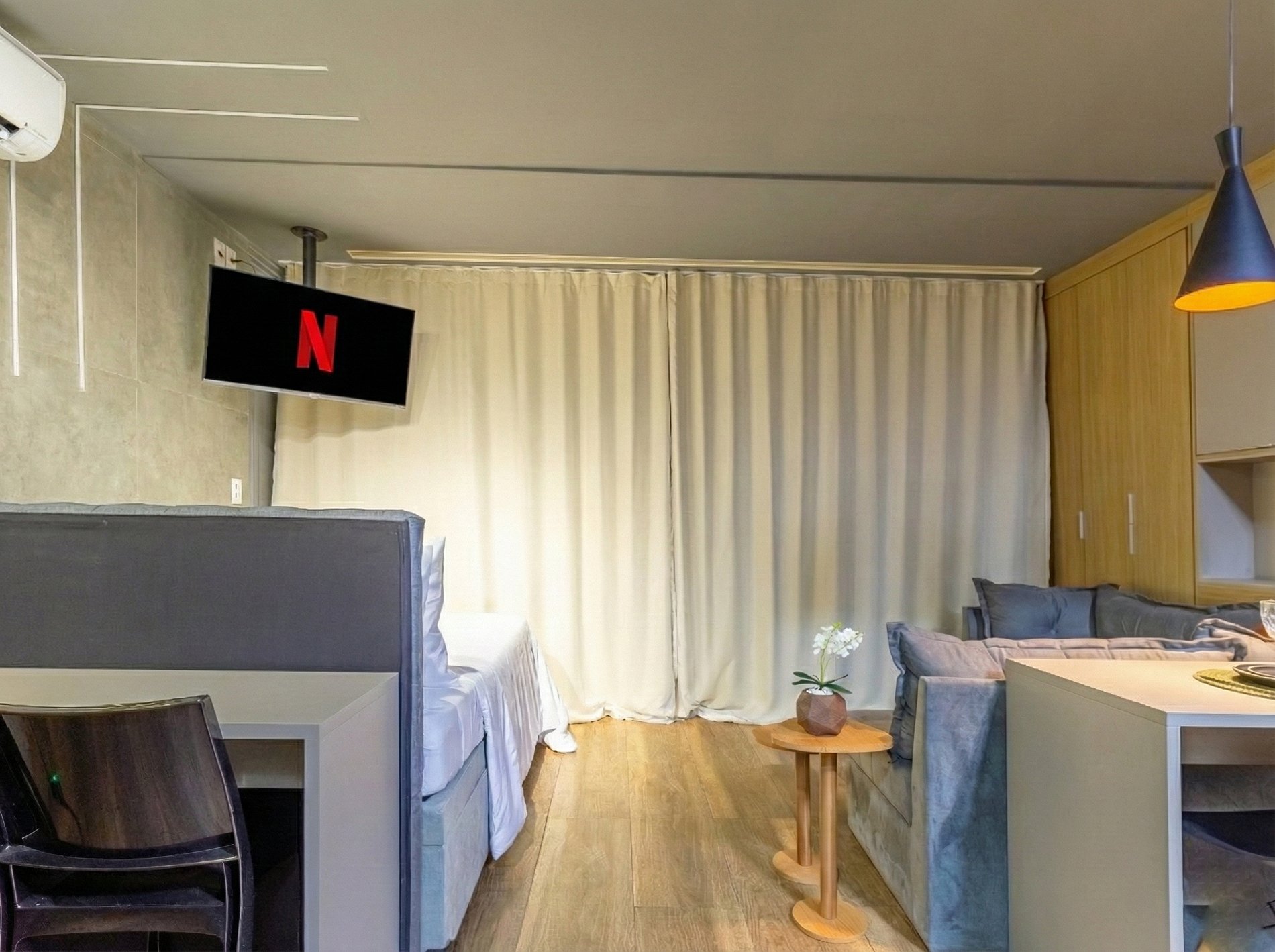 Tudo detalhadamente planejado com o que você precisa para uma das melhores estadias da sua vida. Studio com Cama Casal, Armário com cabideiro, Ar condicionado split e cortina com blackout; Ambiente confortável com Smart TV de 40 polegadas, Wi-fi de 300Mbps, e Sofá ; Cozinha com Geladeira, Fogão, Micro-ondas, Cafeteira, Liquidificador, Sanduicheira, Louças e Panelas. Banheiro com Água aquecida e Toalhas de banho macias.