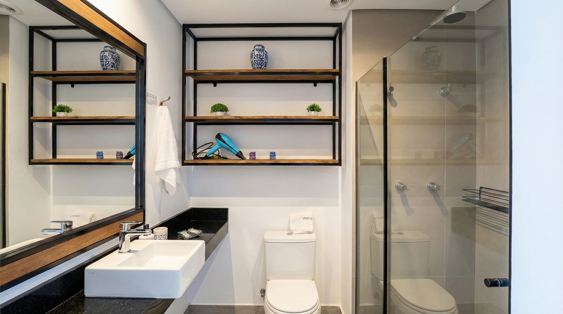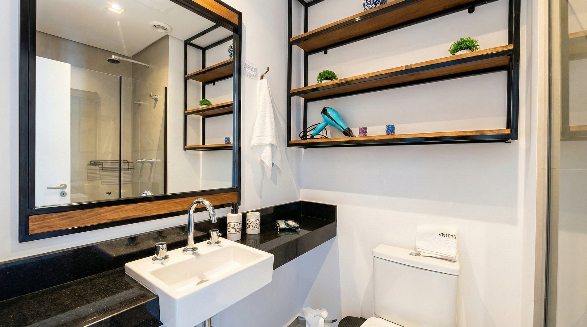 Banheiro moderno com chuveiro quente e amenities de cortesia.