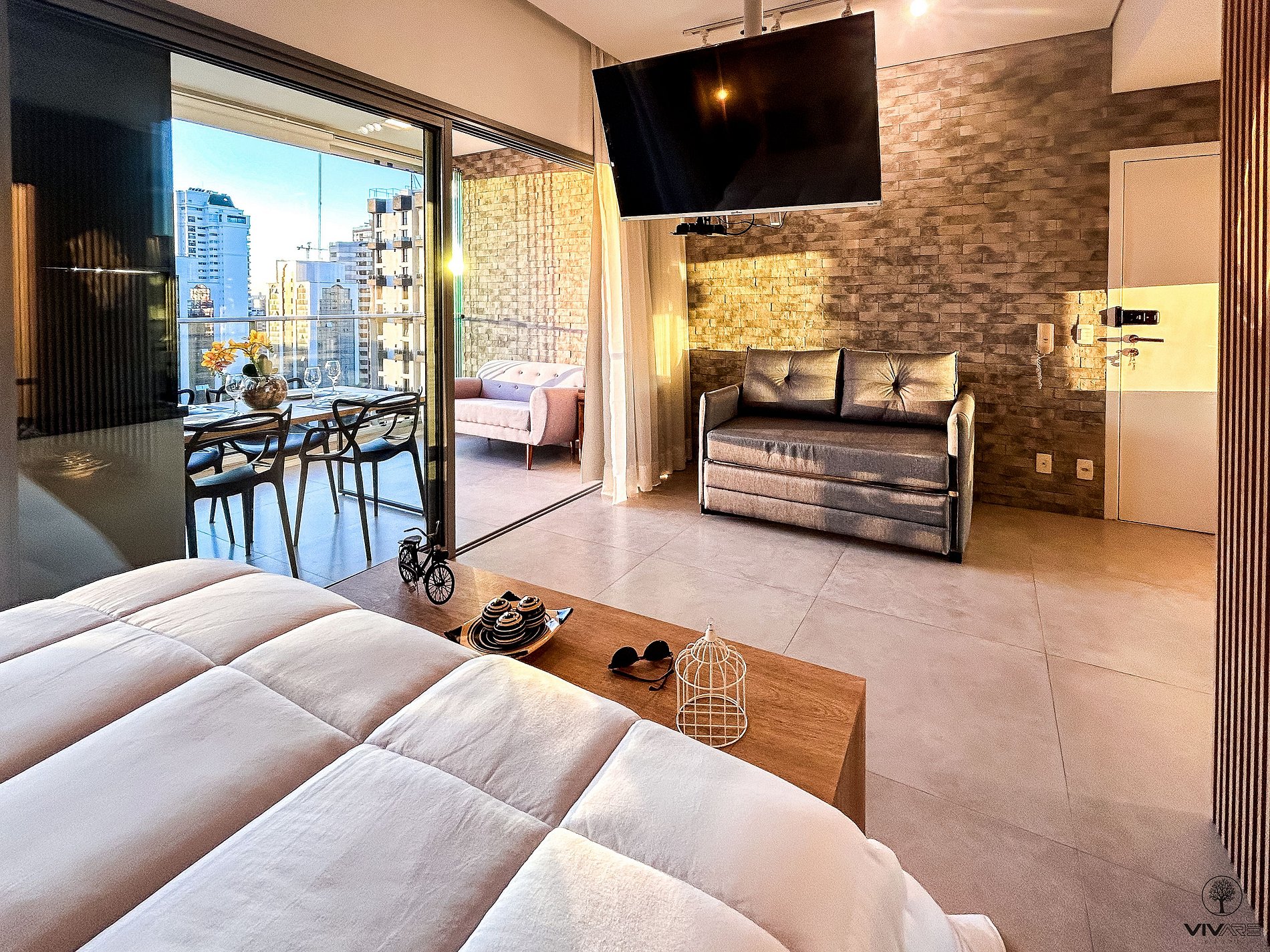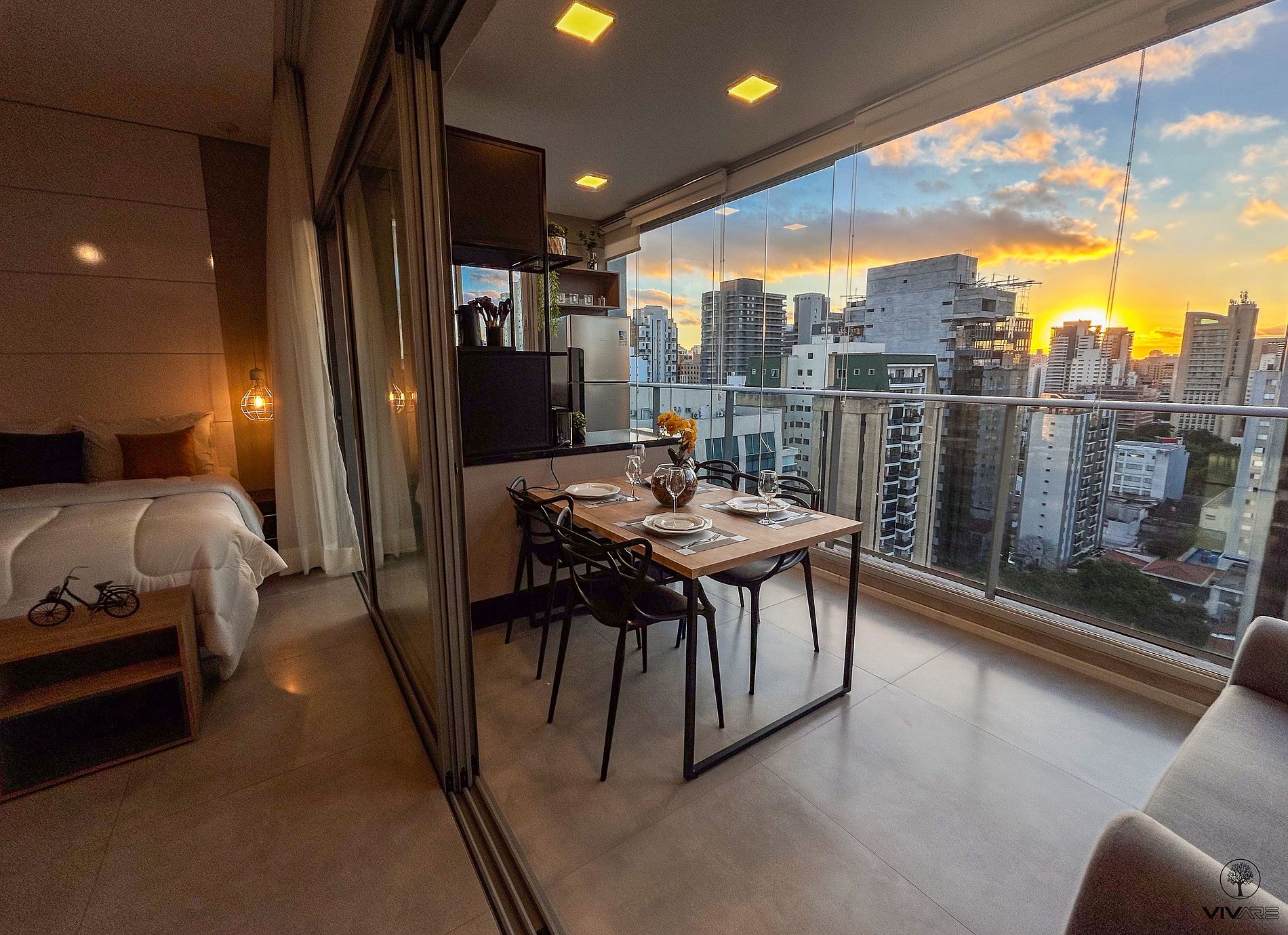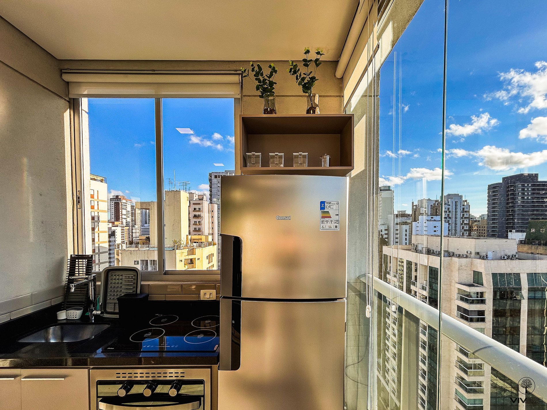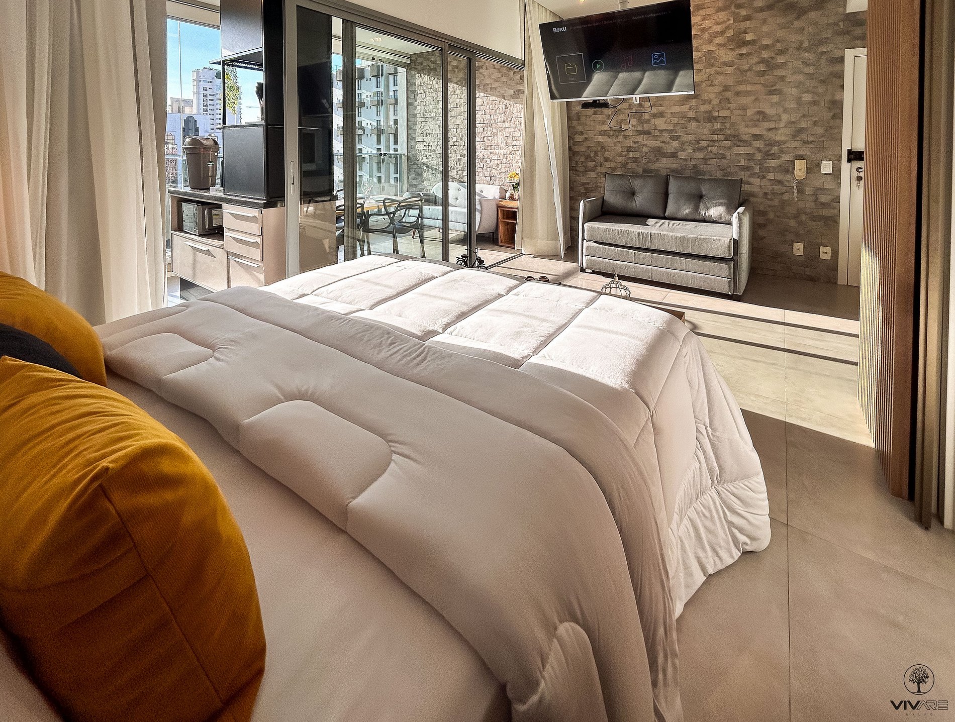 Tudo detalhadamente planejado com o que você precisa para uma das melhores estadias da sua vida. Studio com Cama queen size, Armário com cabideiro, Ar condicionado split e cortina com blackout; Ambiente confortável com Smart TV de 43 polegadas, Wi-fi de 300Mbps, e Sofá-cama casal; Cozinha com Geladeira duplex, Fogão, Micro-ondas, Cafeteira, Liquidificador, Sanduicheira, Louças e Panelas. Banheiro com Água aquecida e Toalhas de banho macias.