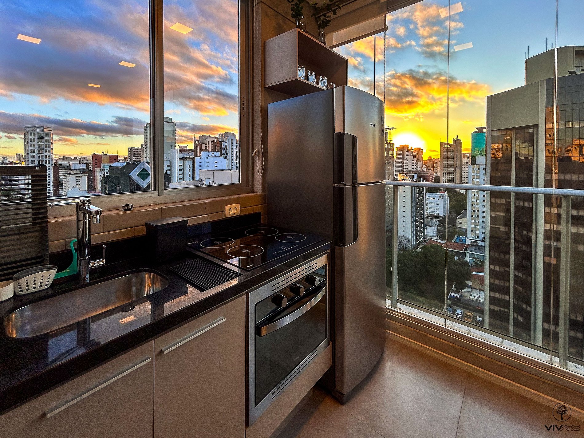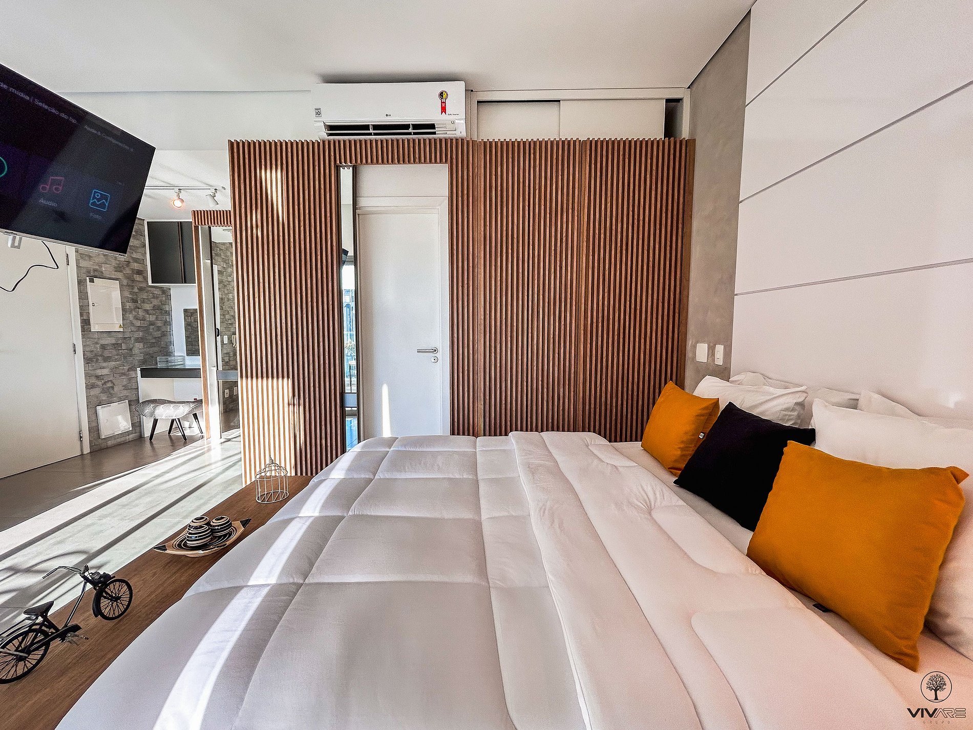 Tudo detalhadamente planejado com o que você precisa para uma das melhores estadias da sua vida. Studio com Cama queen size, Armário com cabideiro, Ar condicionado split e cortina com blackout; Ambiente confortável com Smart TV de 43 polegadas, Wi-fi de 300Mbps, e Sofá-cama casal; Cozinha com Geladeira duplex, Fogão, Micro-ondas, Cafeteira, Liquidificador, Sanduicheira, Louças e Panelas. Banheiro com Água aquecida e Toalhas de banho macias.