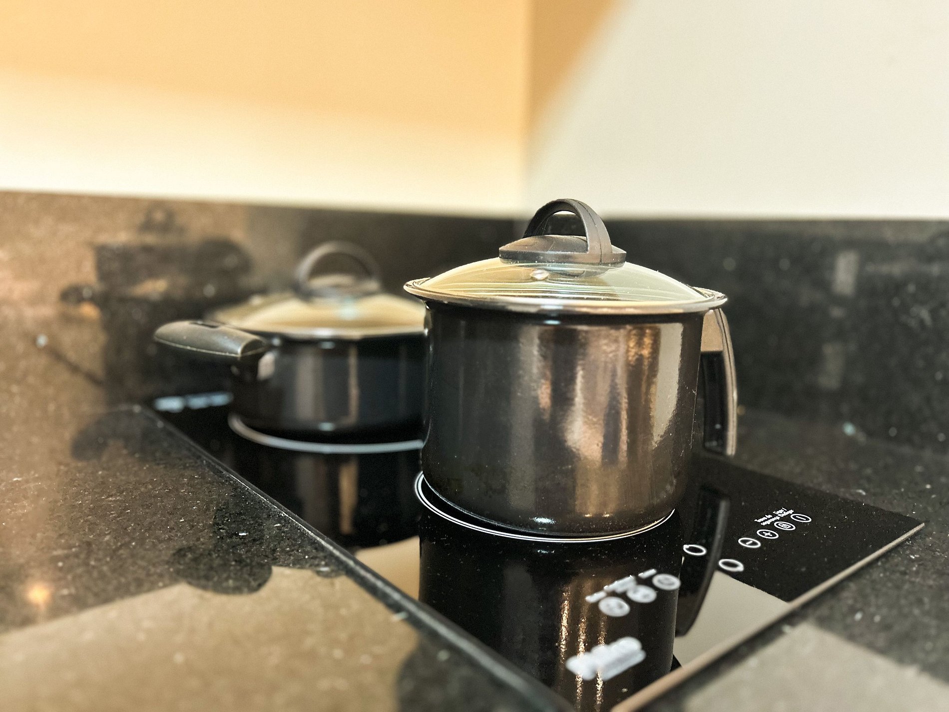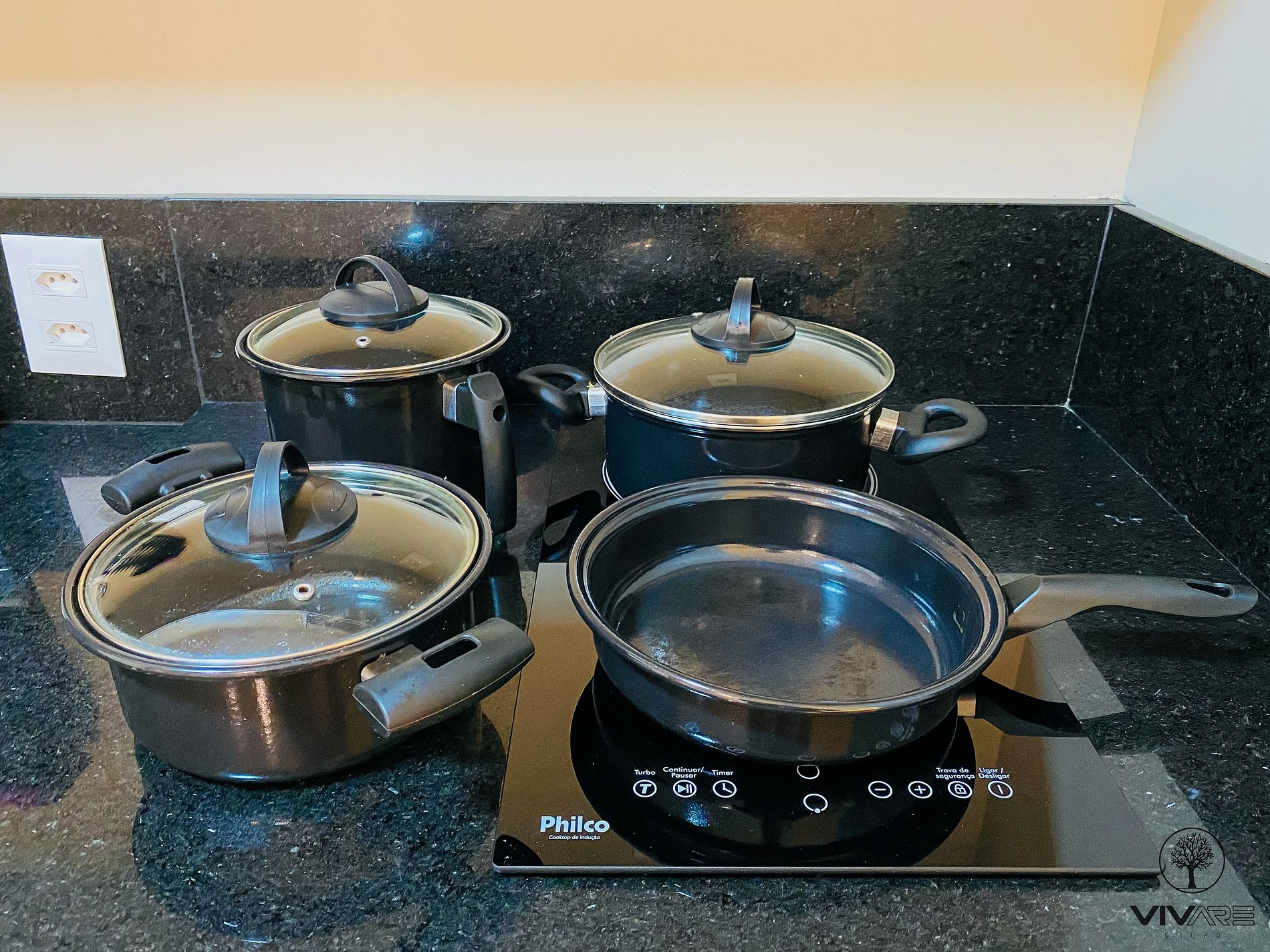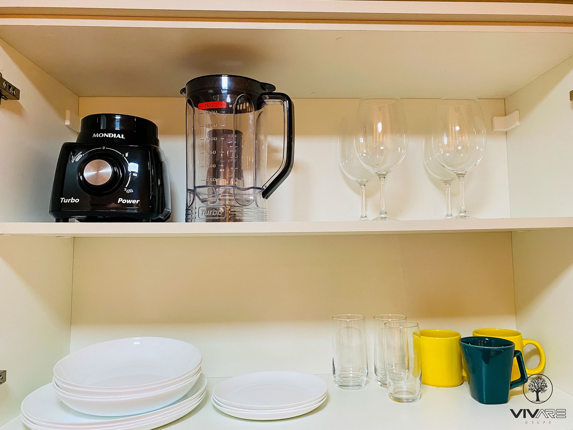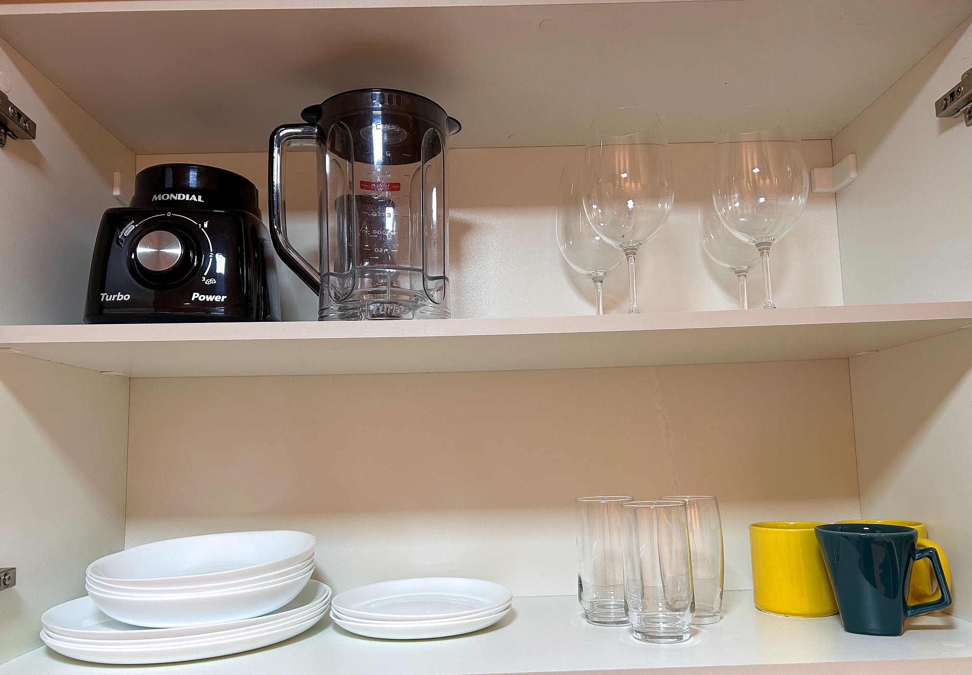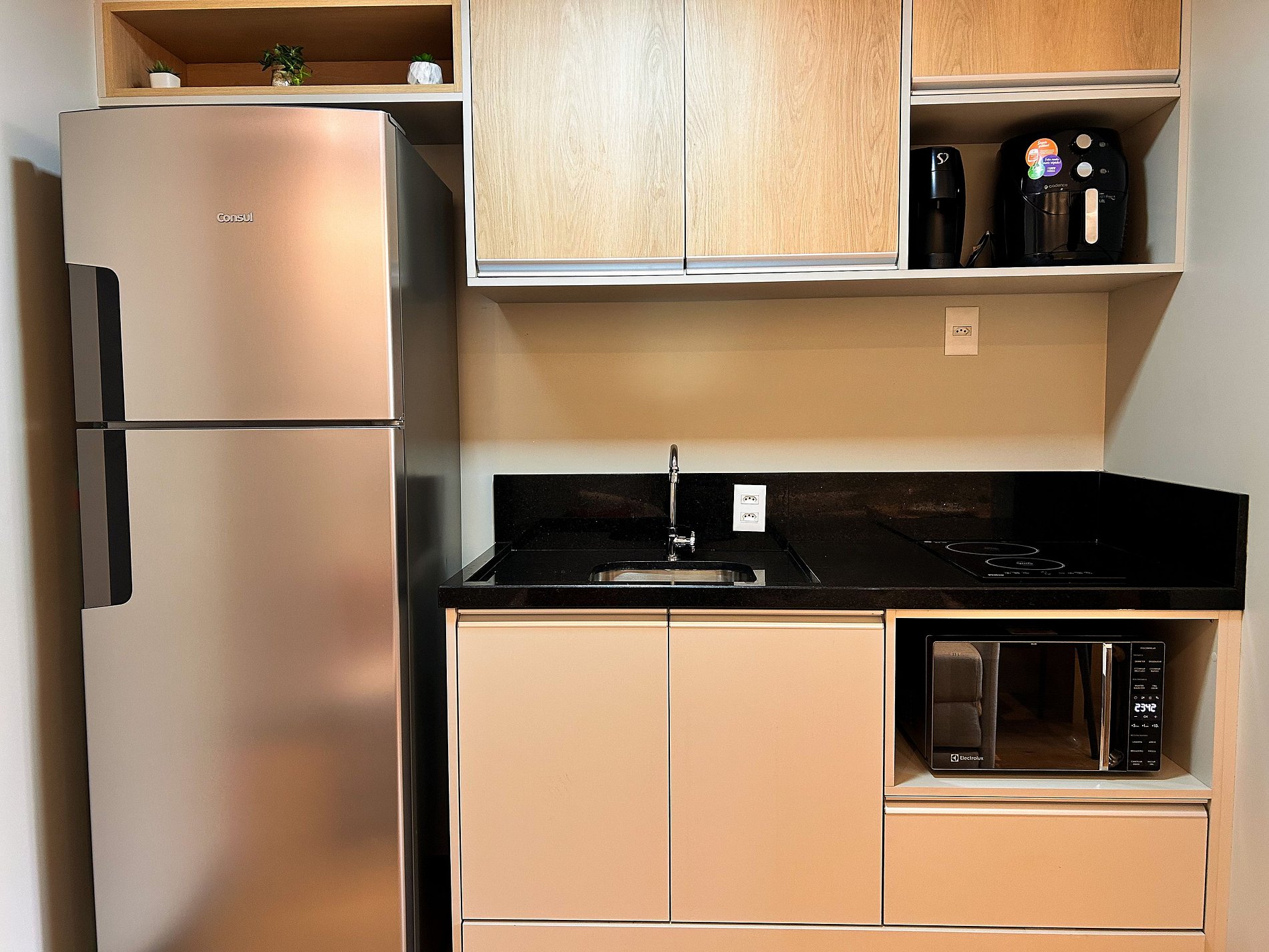 Cozinha com Geladeira, Fogão, Micro-ondas, Cafeteira, Liquidificador, Louça, e Panelas.
