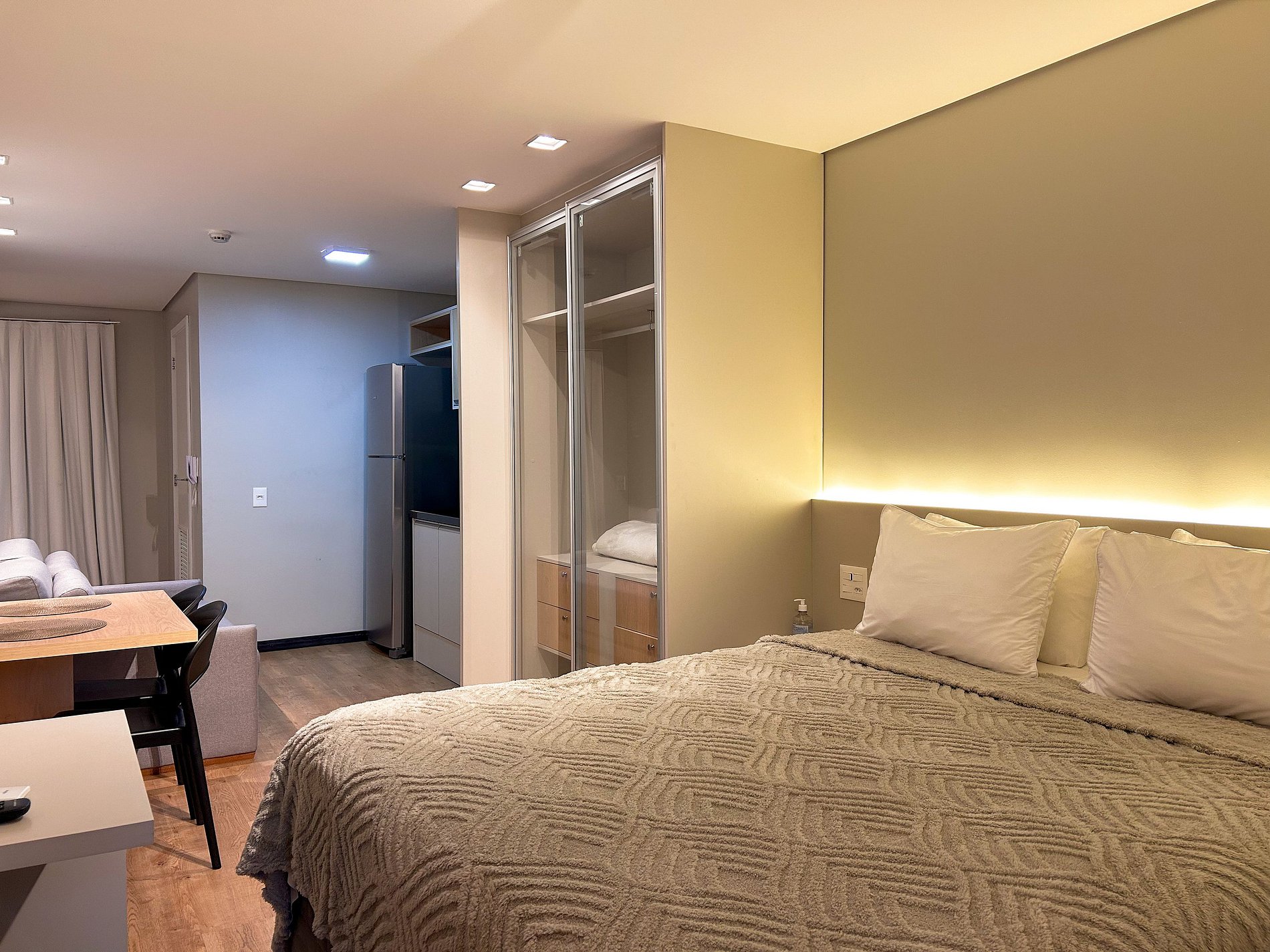 Studio com Cama queen size, Armário com cabideiro, Ar condicionado split e sacada.
