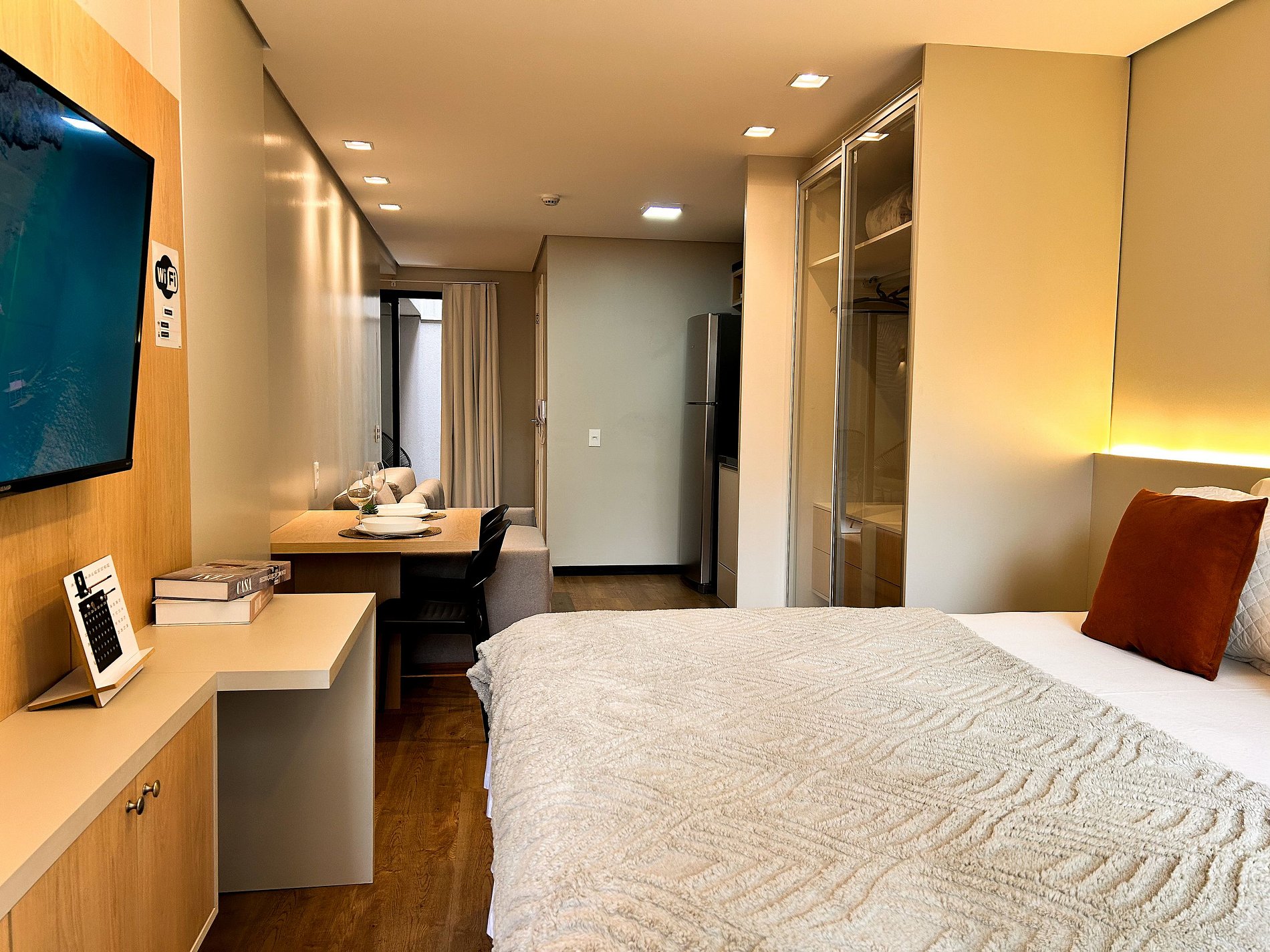 Ambiente confortável com Smart TV de 40’, Wi-fi de 250Mbps, e Sofá-cama;