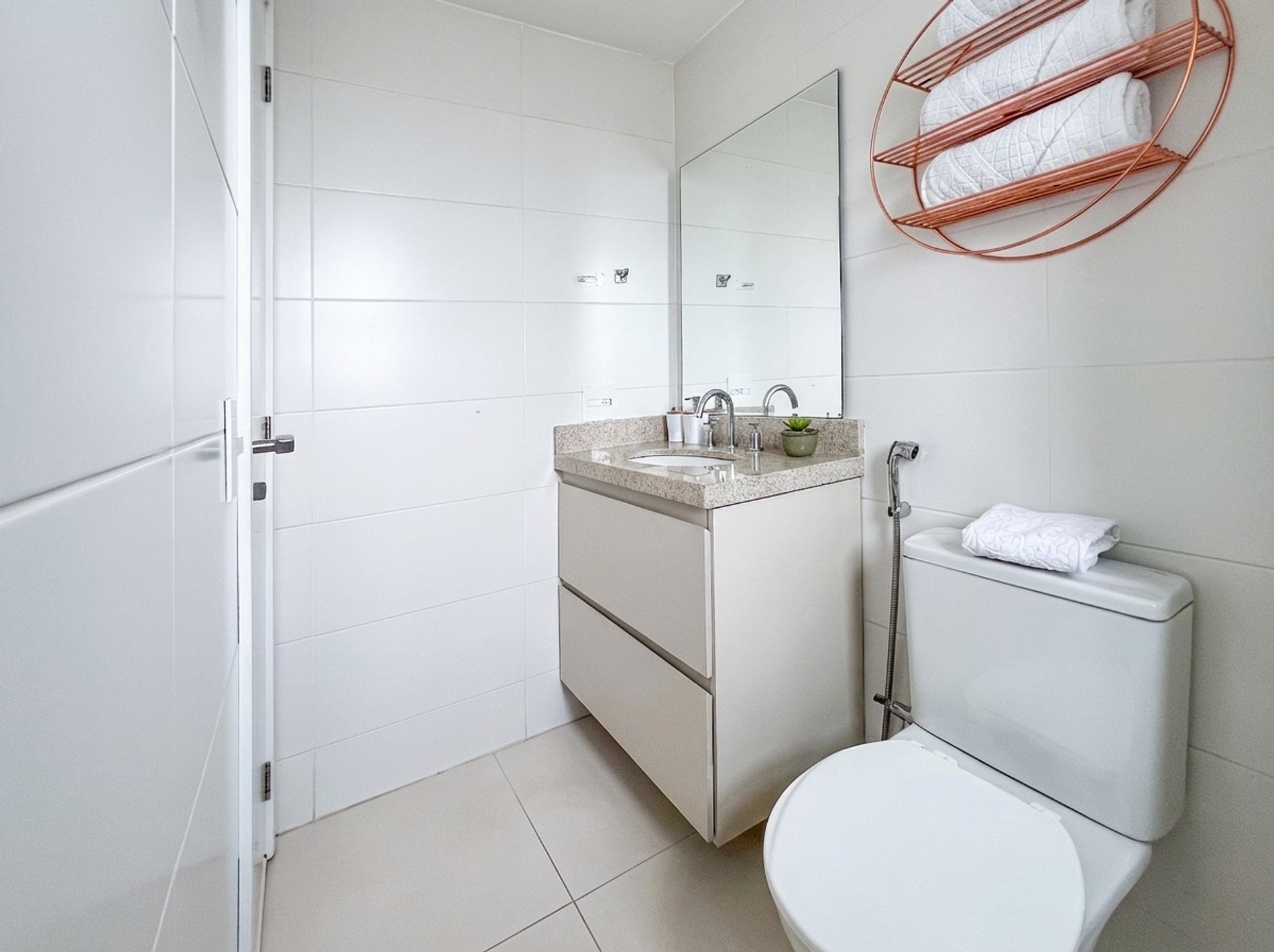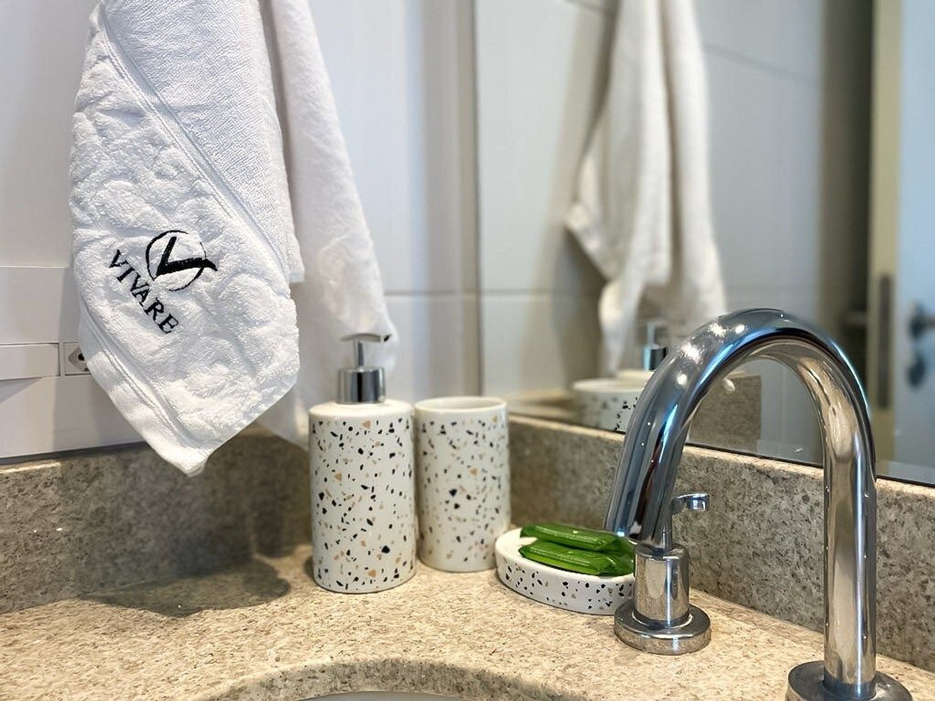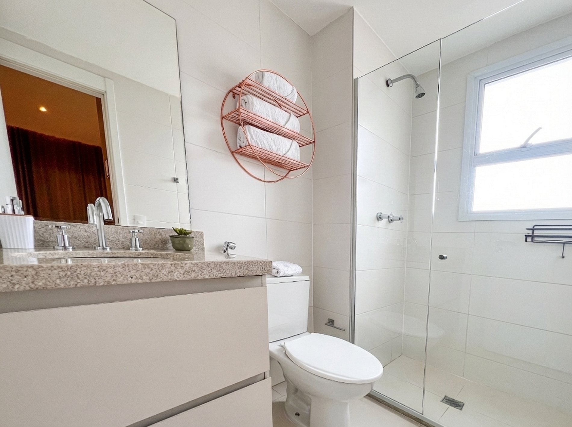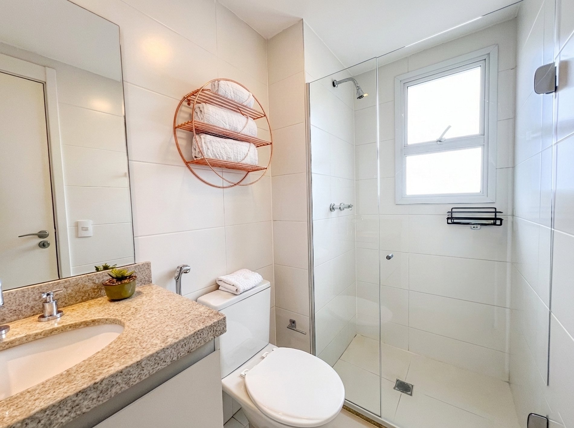 Banheiro moderno com chuveiro quente e amenities de cortesia.