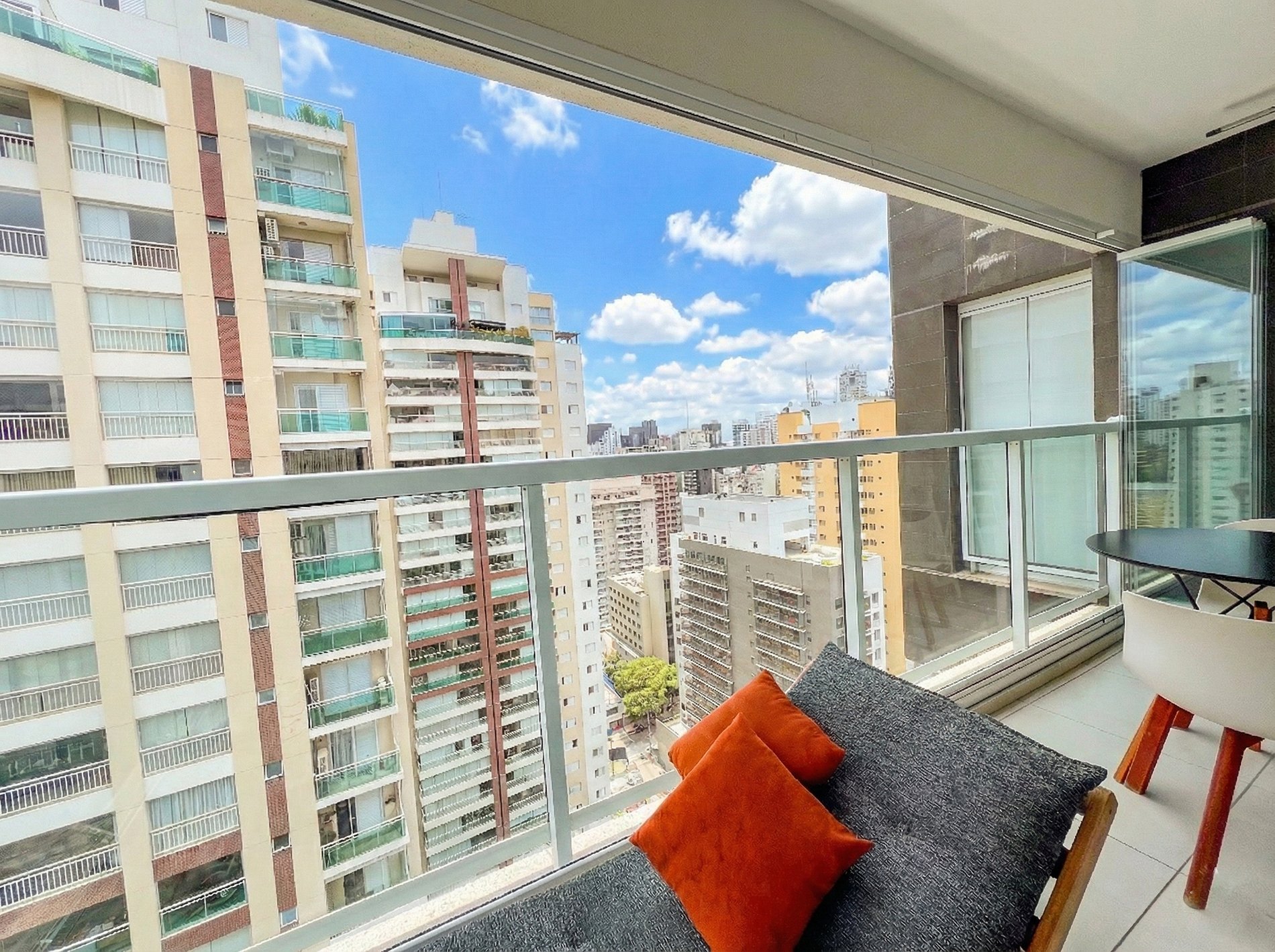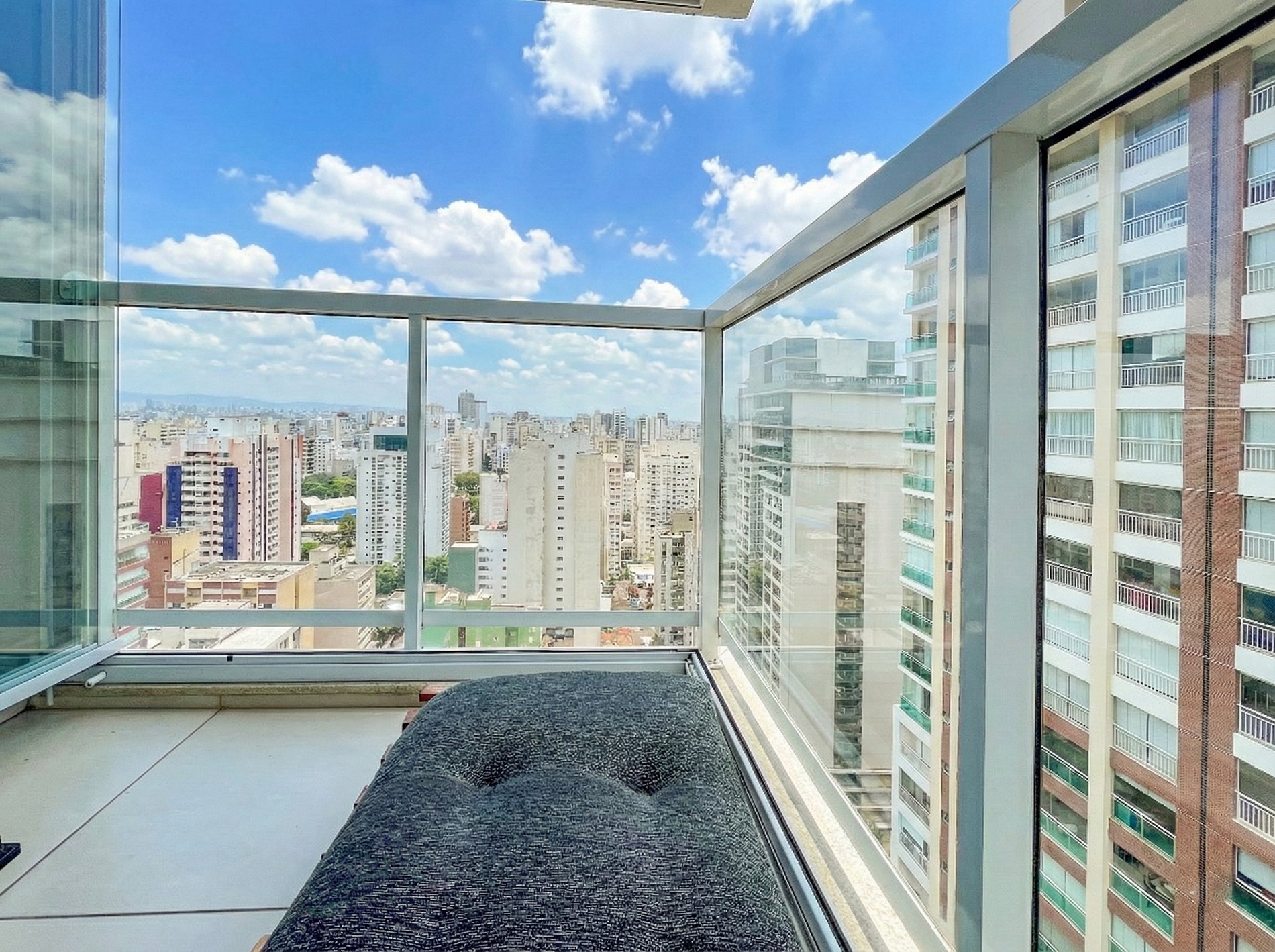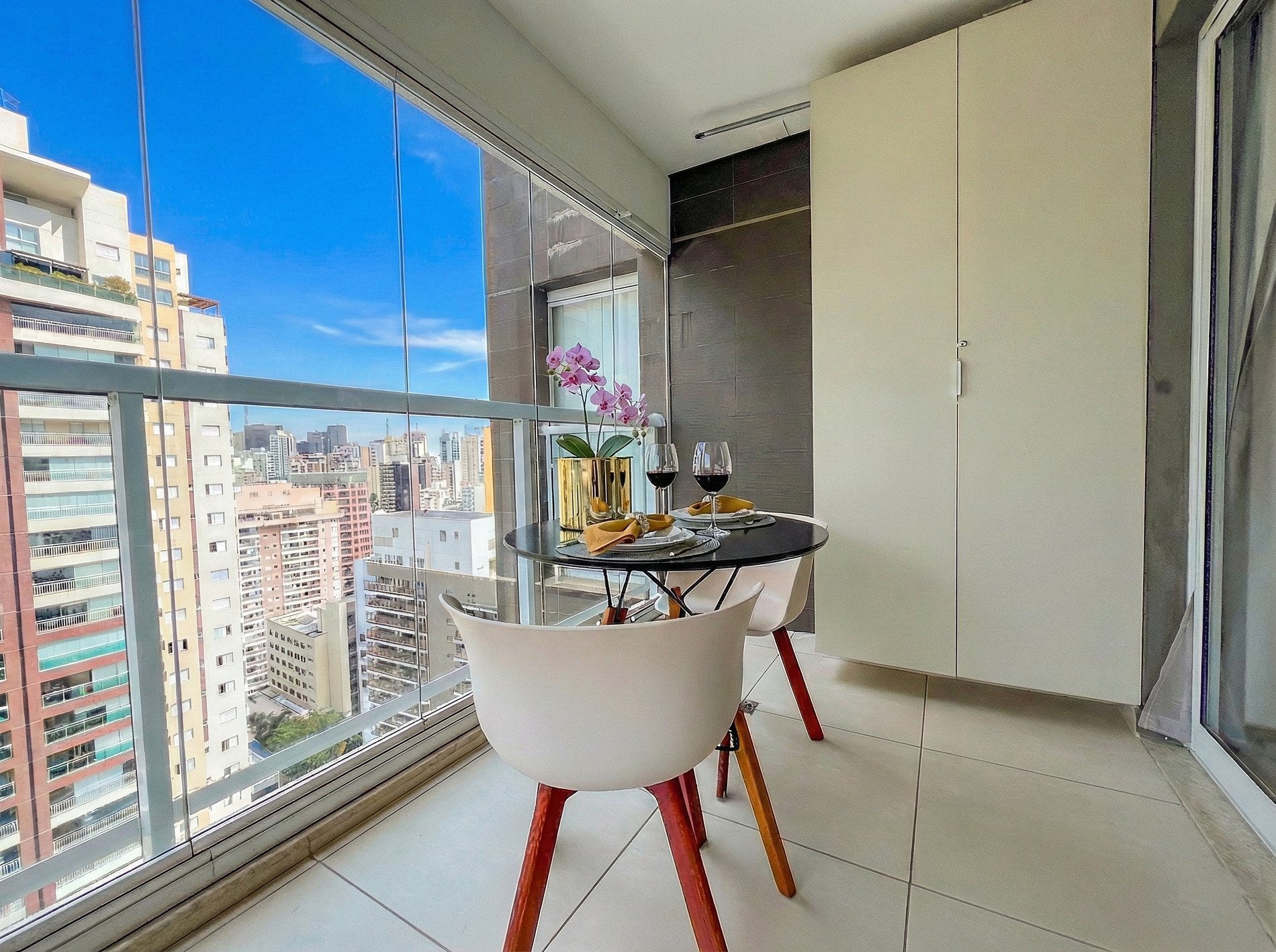Varanda privativa com vista para a cidade, perfeita para relaxar após um dia explorando São Paulo.