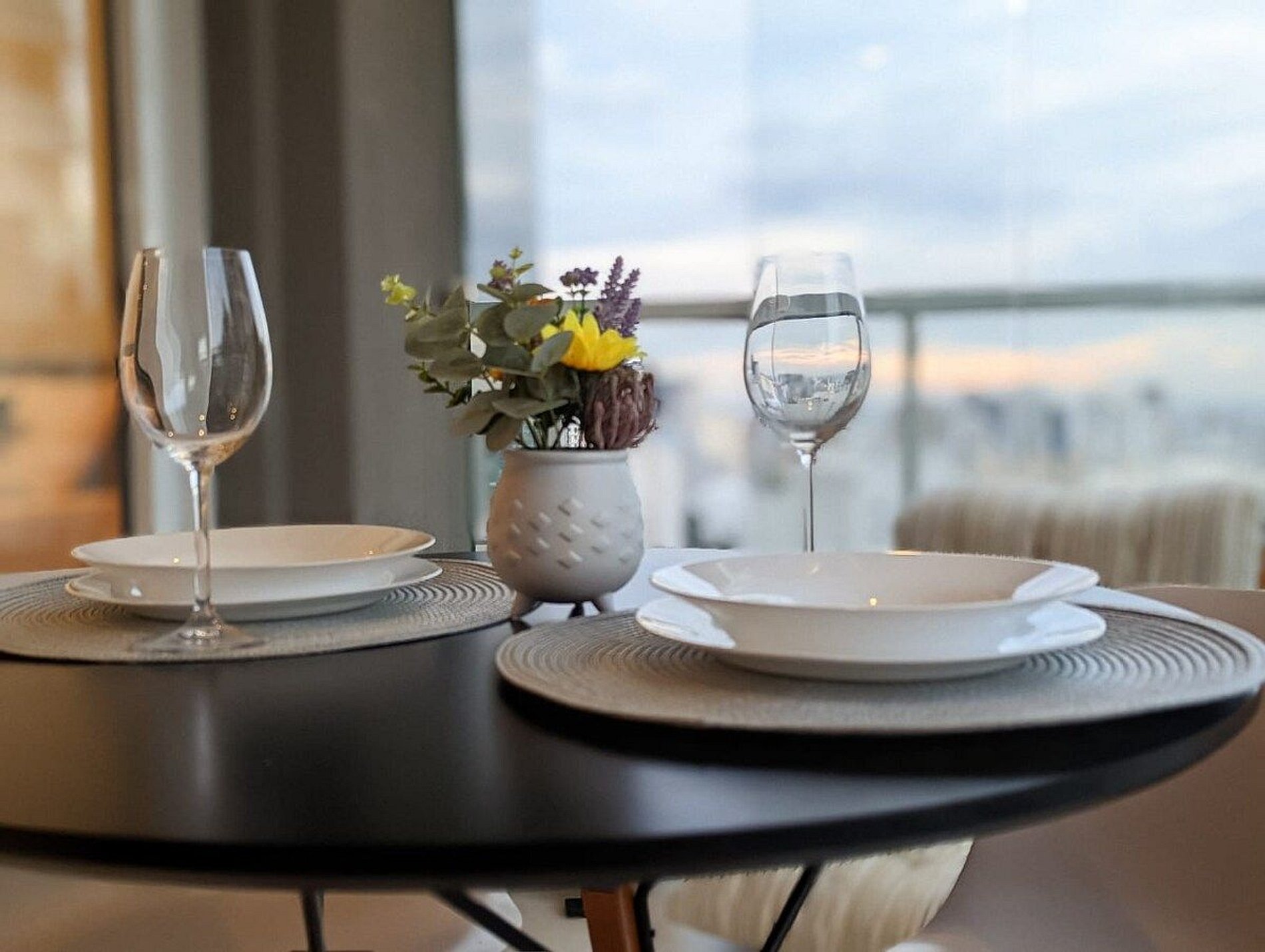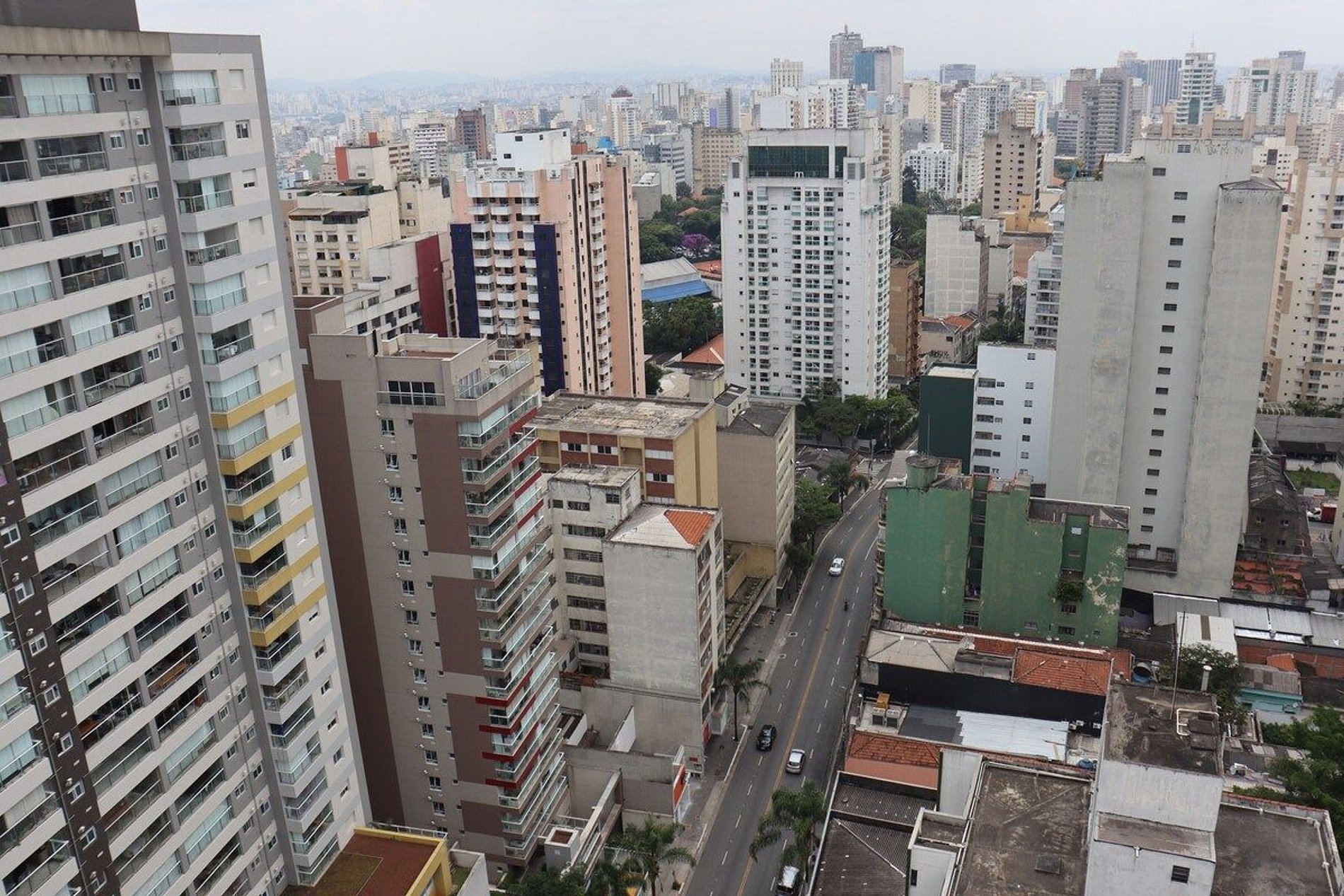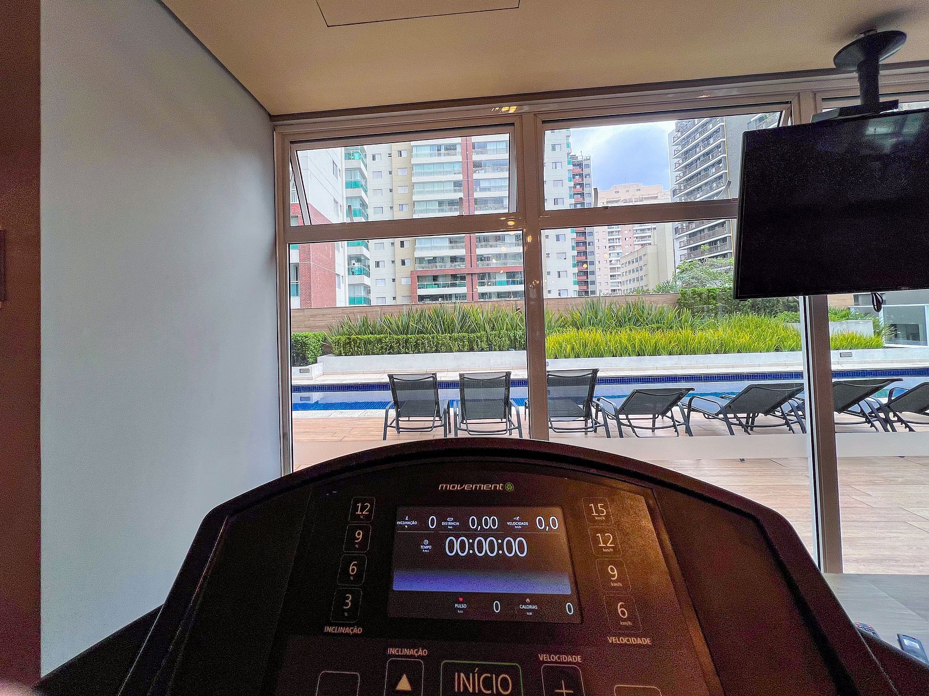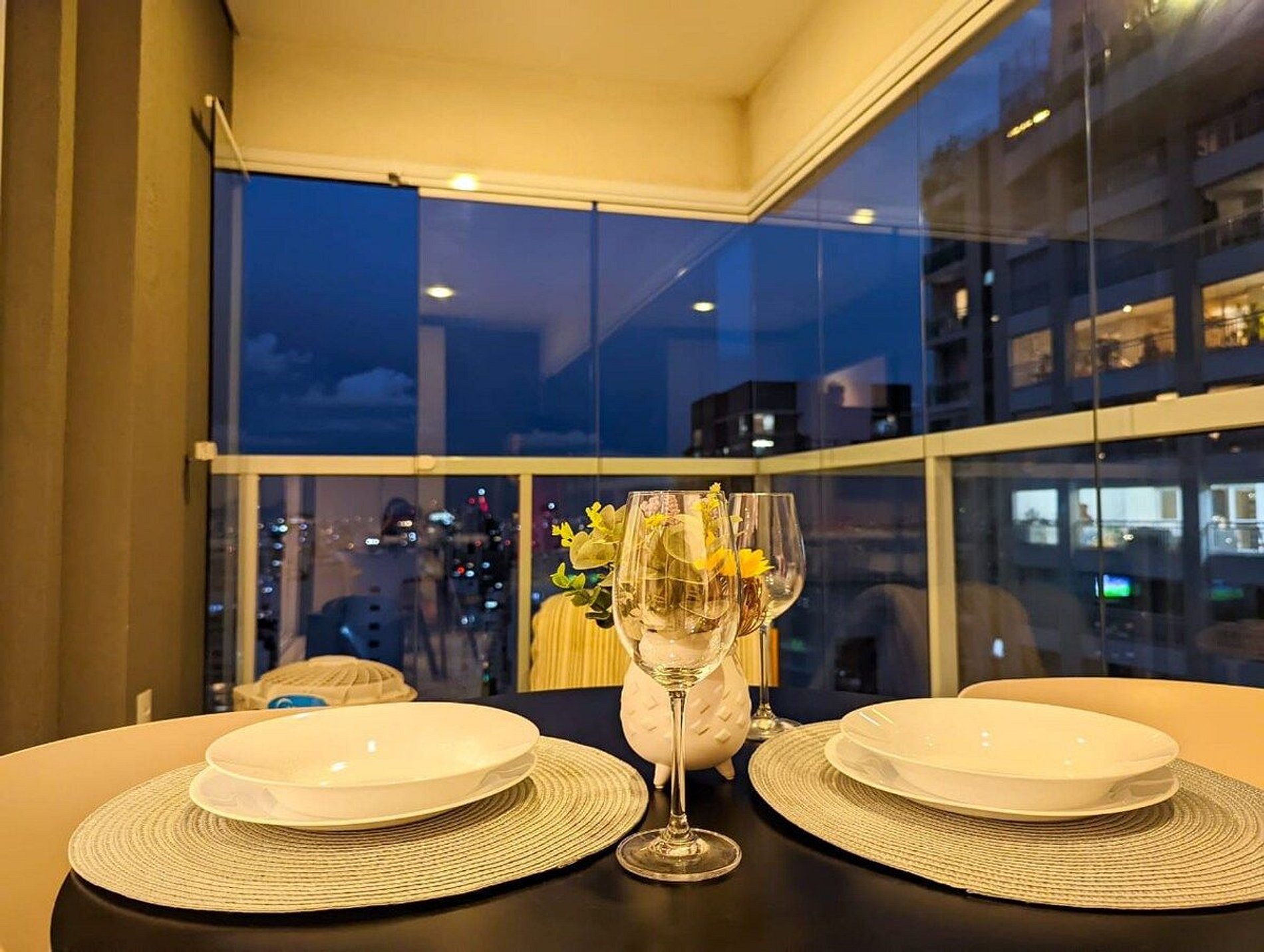 Varanda privativa com vista para a cidade, perfeita para relaxar após um dia explorando São Paulo.