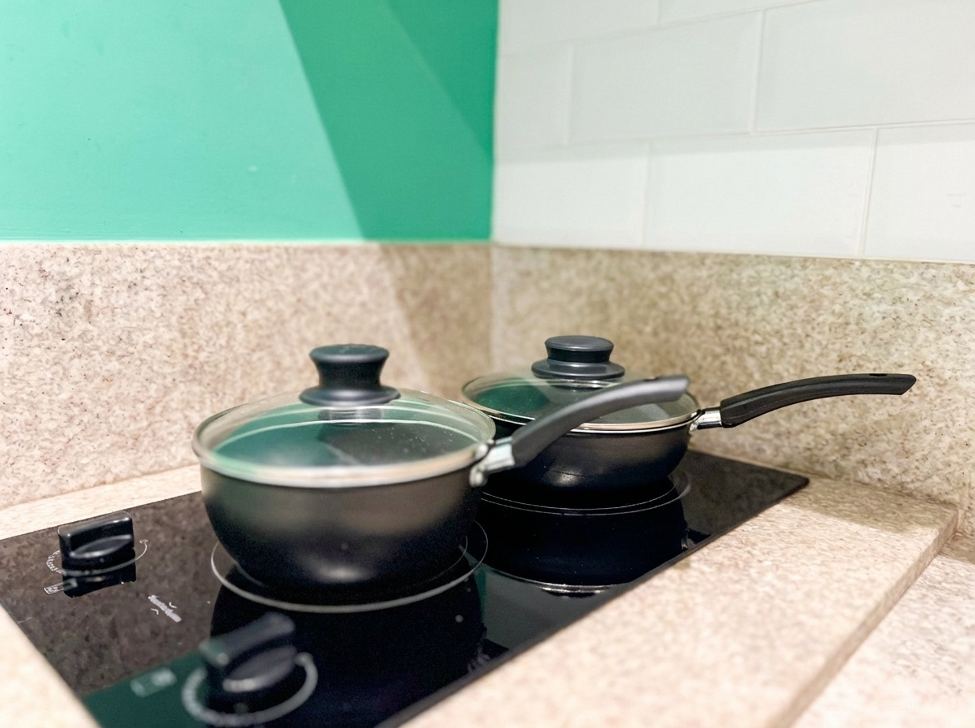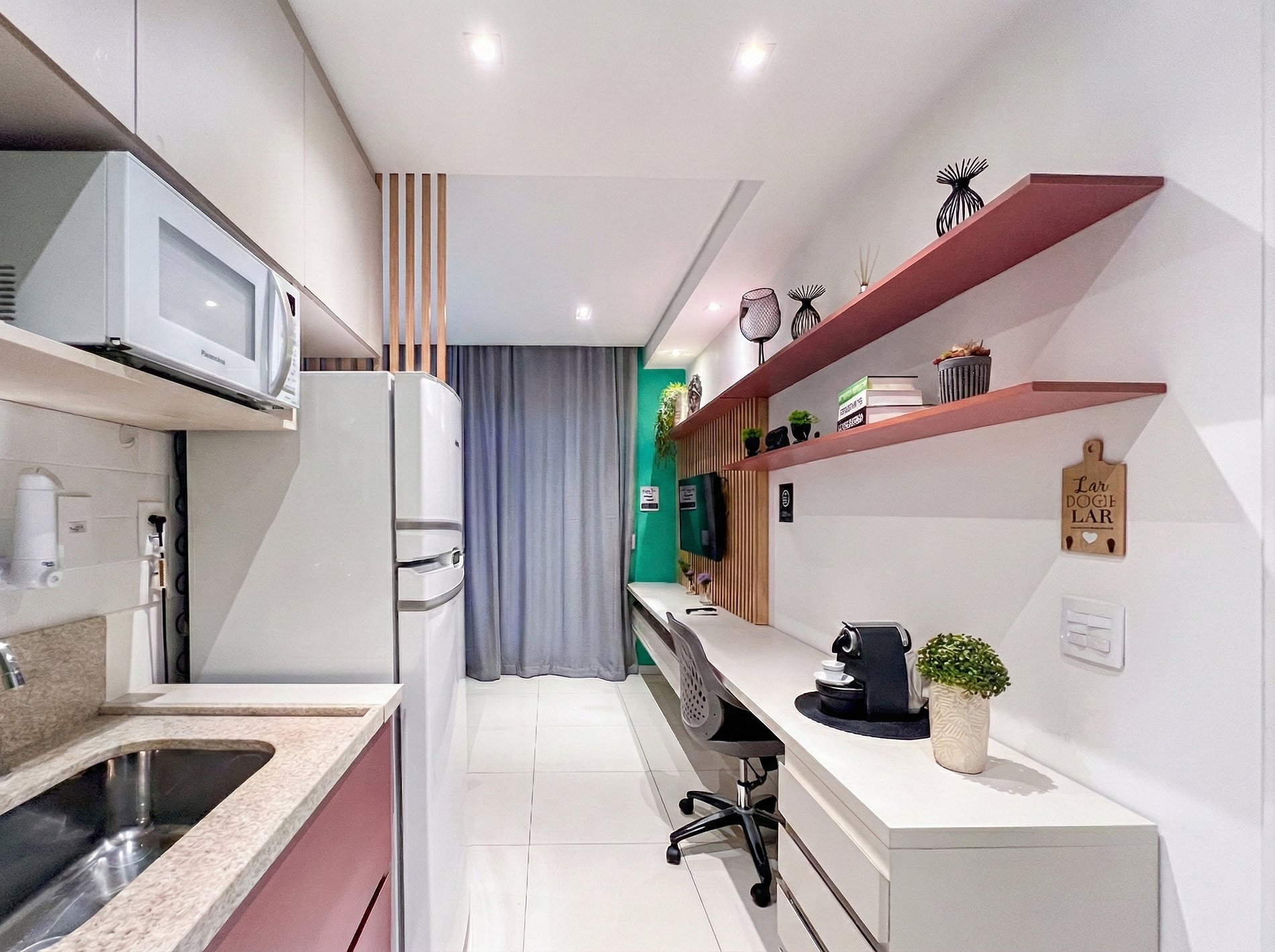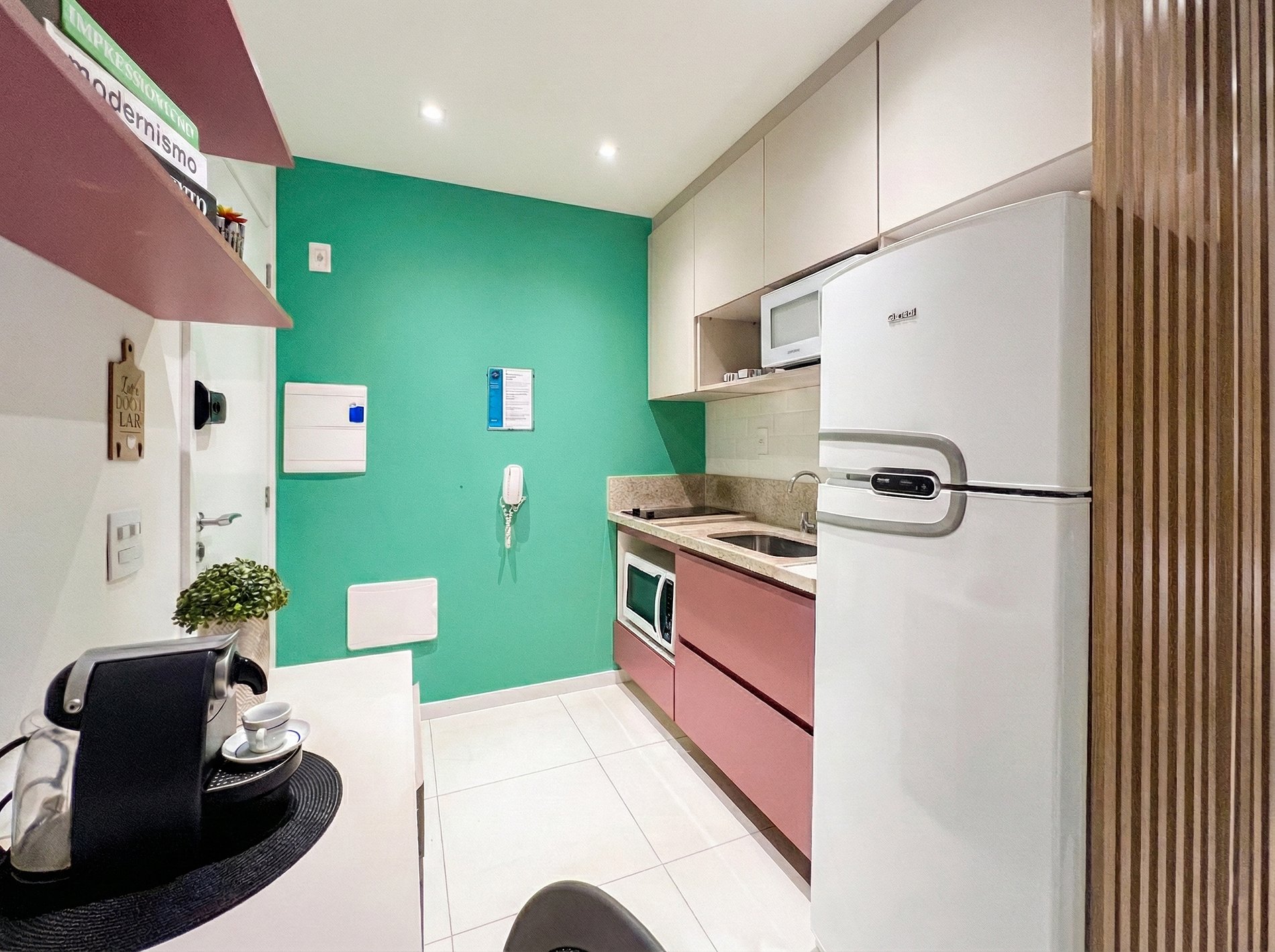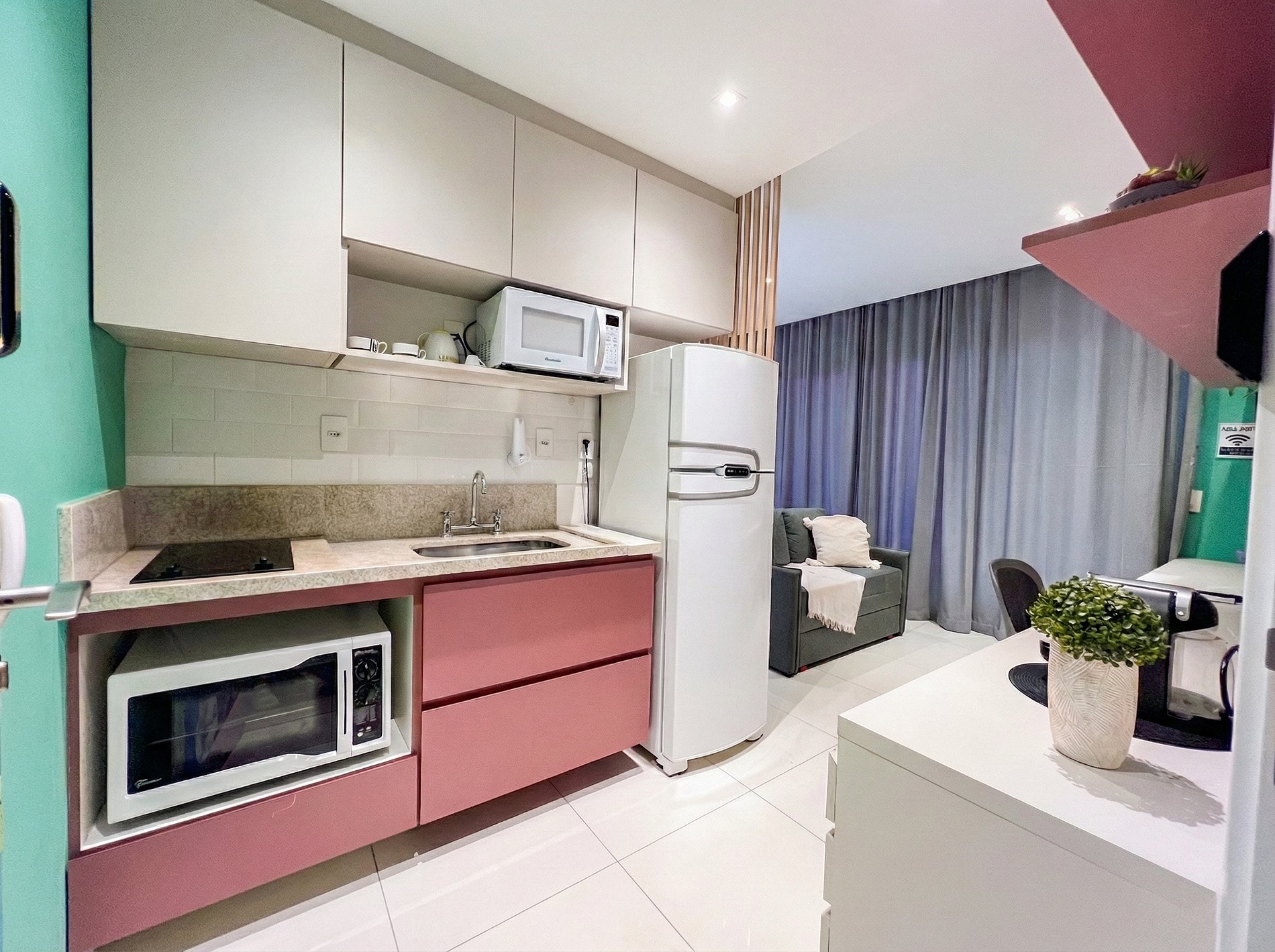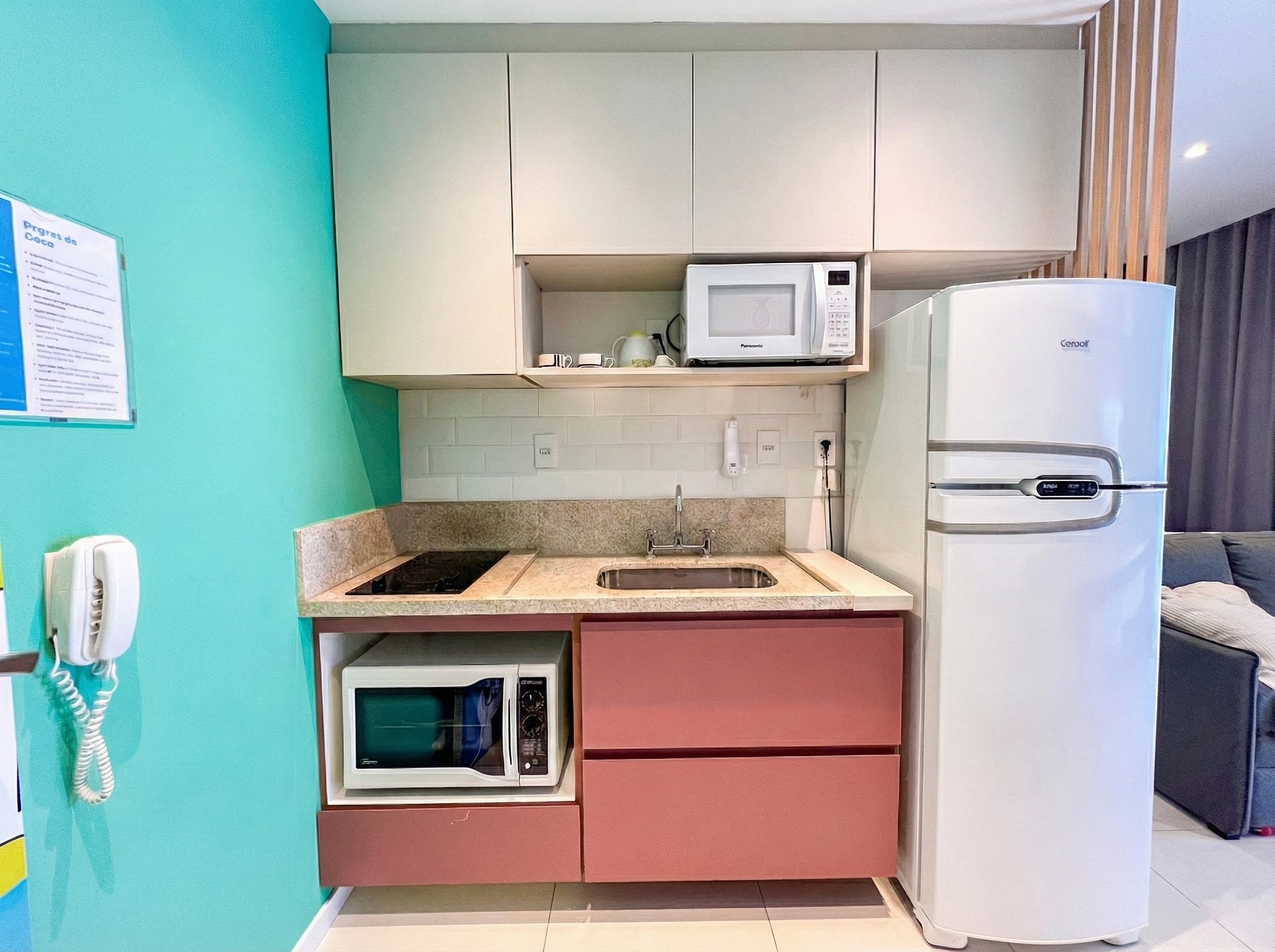 Cozinha compacta equipada com utensílios essenciais para preparar suas refeições.