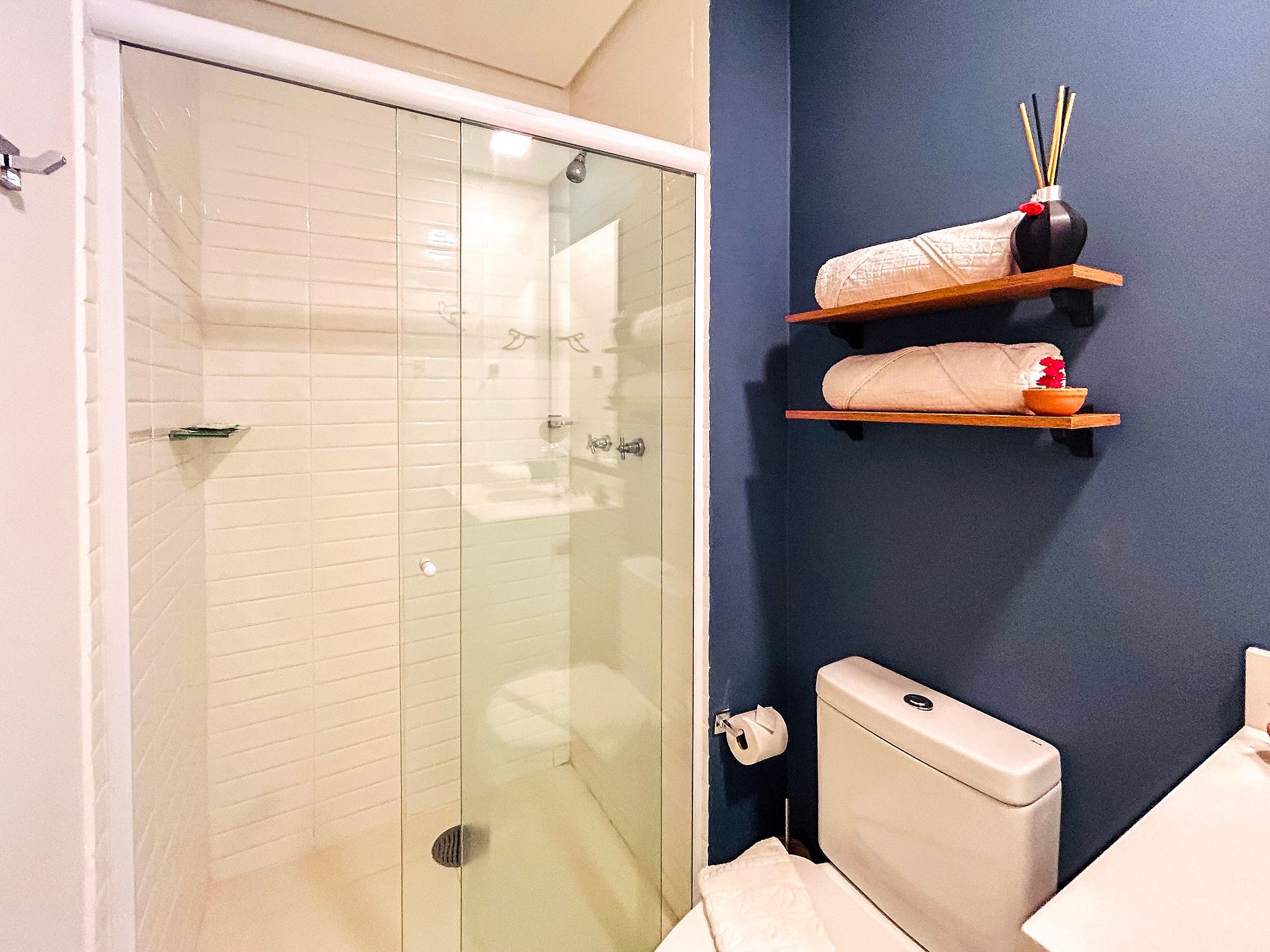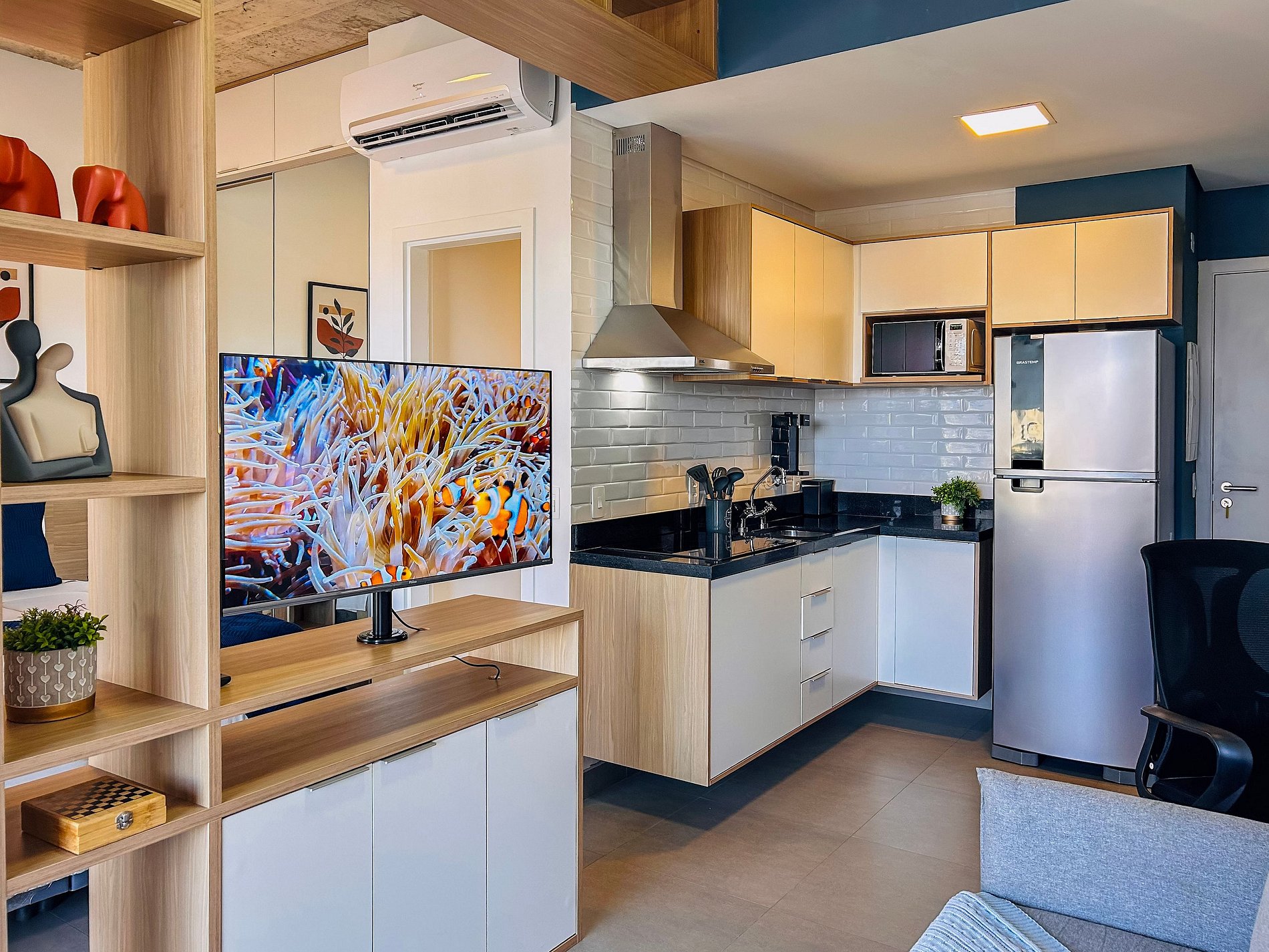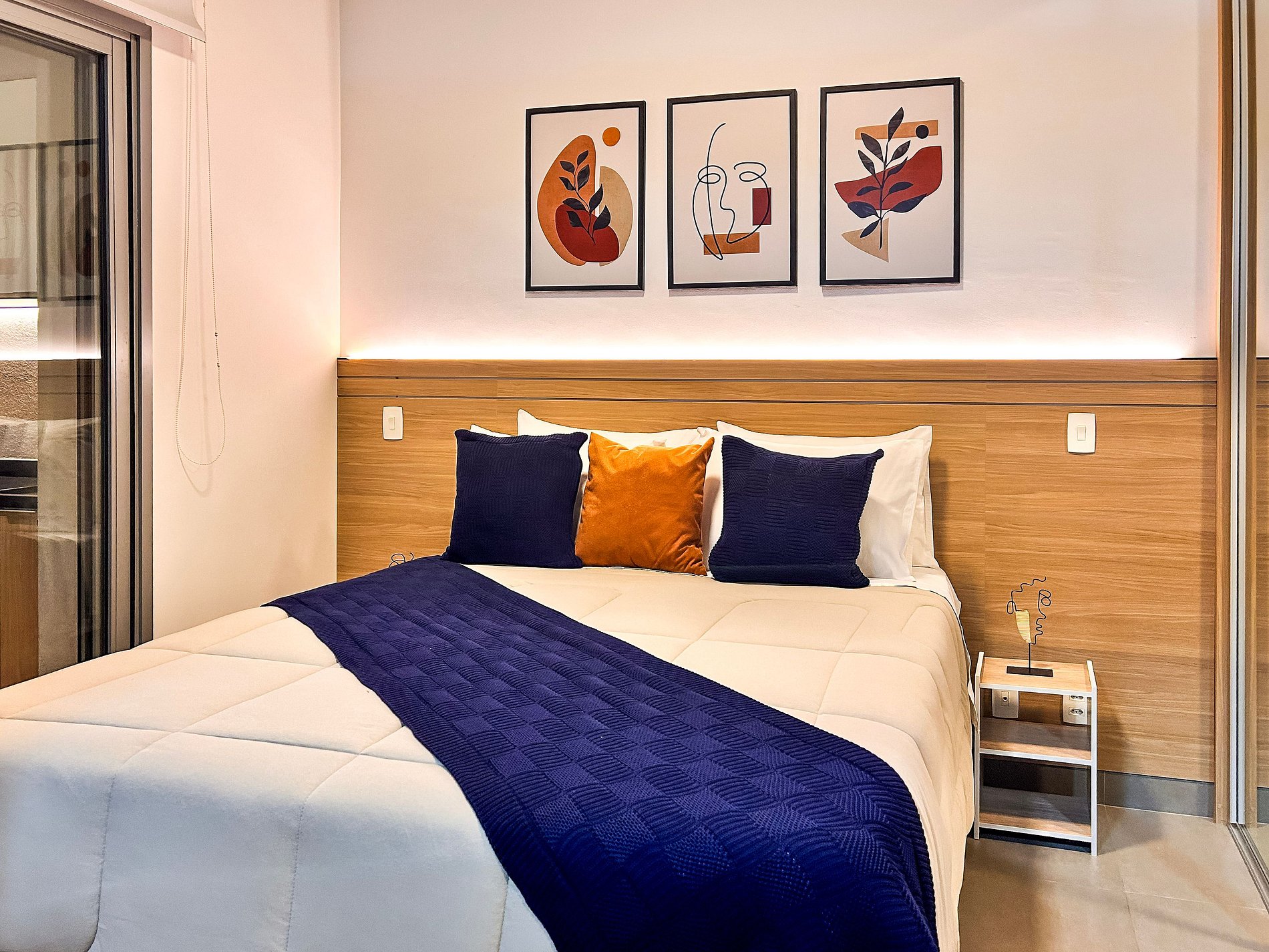 Tudo detalhadamente planejado com o que você precisa para uma das melhores estadias da sua vida. Studio com Cama queen size, Armário com cabideiro, Ar condicionado split e cortina com blackout; Ambiente confortável com Smart TV de 40 polegadas, Wi-fi de 300Mbps, e Sofá-cama casal; Cozinha com Geladeira duplex, Fogão, Micro-ondas, Cafeteira, Liquidificador, Sanduicheira, Louças e Panelas. Banheiro com Água aquecida e Toalhas de banho macias.