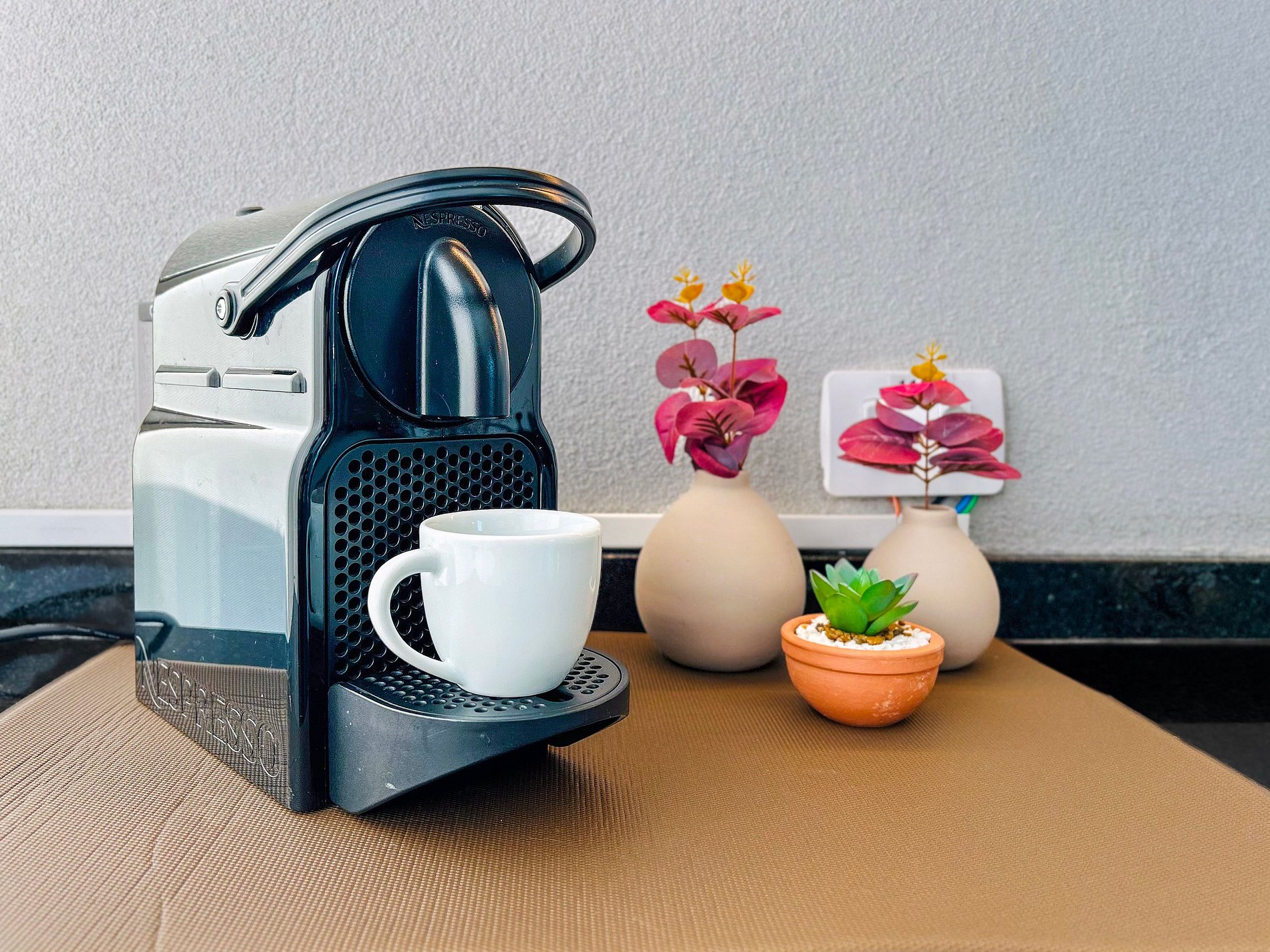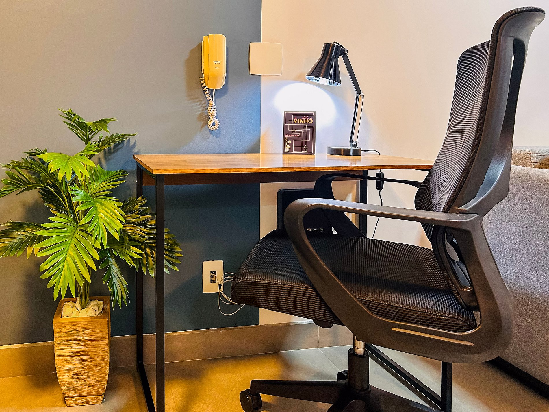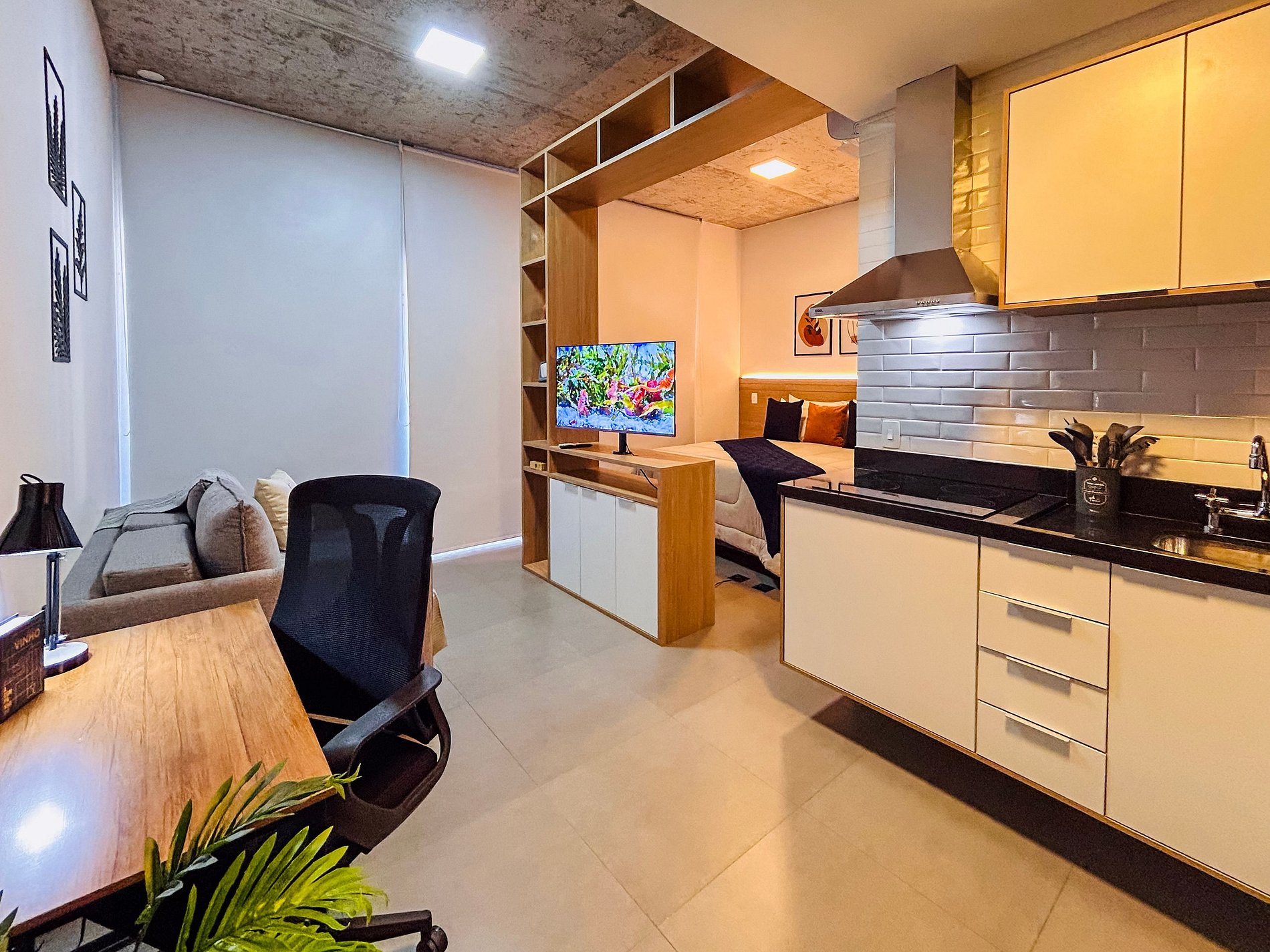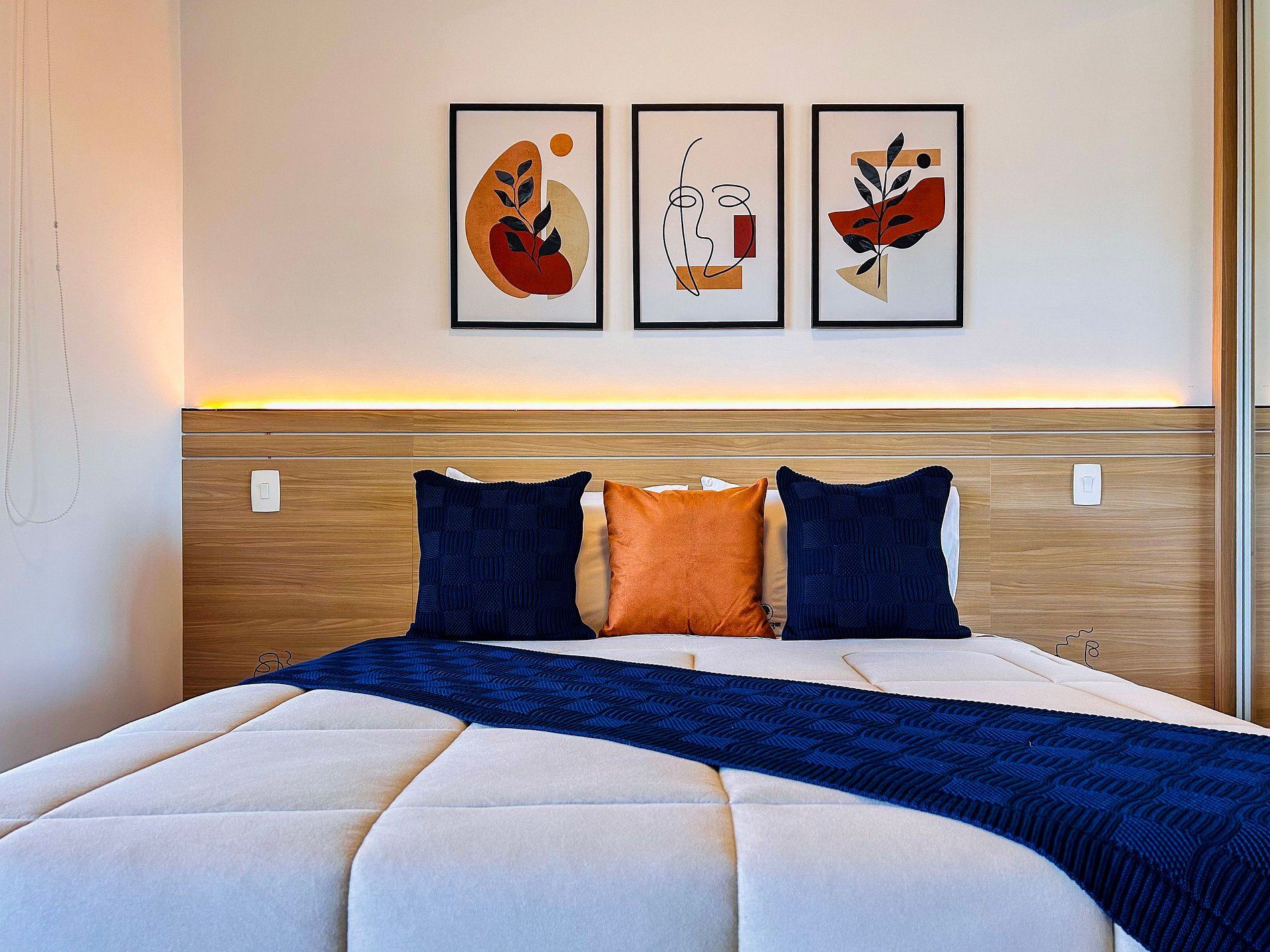 Tudo detalhadamente planejado com o que você precisa para uma das melhores estadias da sua vida. Studio com Cama queen size, Armário com cabideiro, Ar condicionado split e cortina com blackout; Ambiente confortável com Smart TV de 40 polegadas, Wi-fi de 300Mbps, e Sofá-cama casal; Cozinha com Geladeira duplex, Fogão, Micro-ondas, Cafeteira, Liquidificador, Sanduicheira, Louças e Panelas. Banheiro com Água aquecida e Toalhas de banho macias.