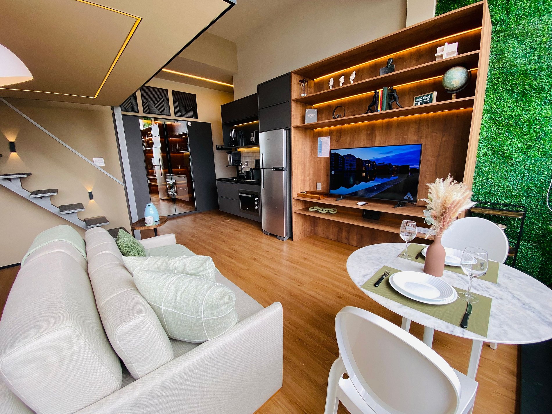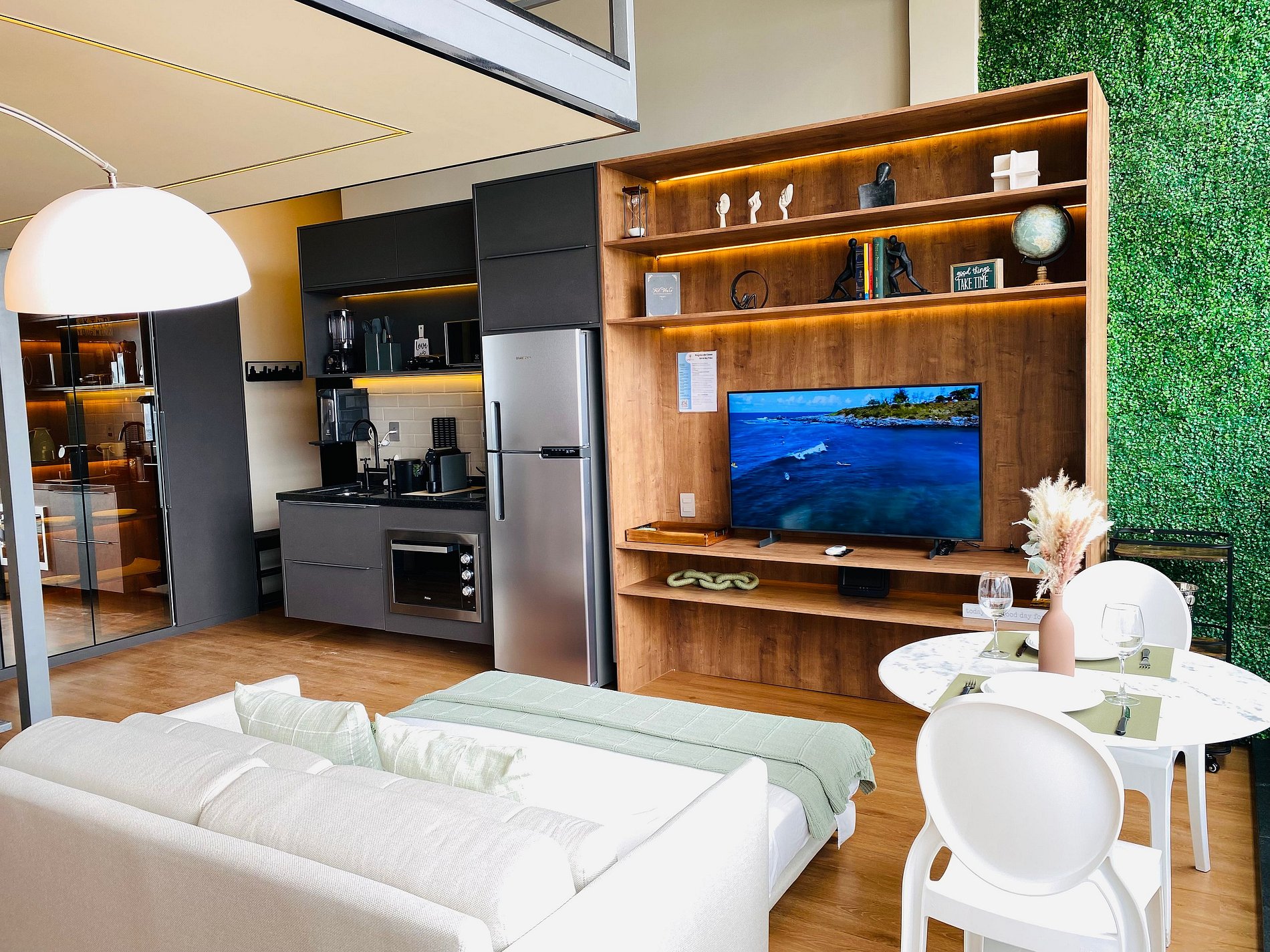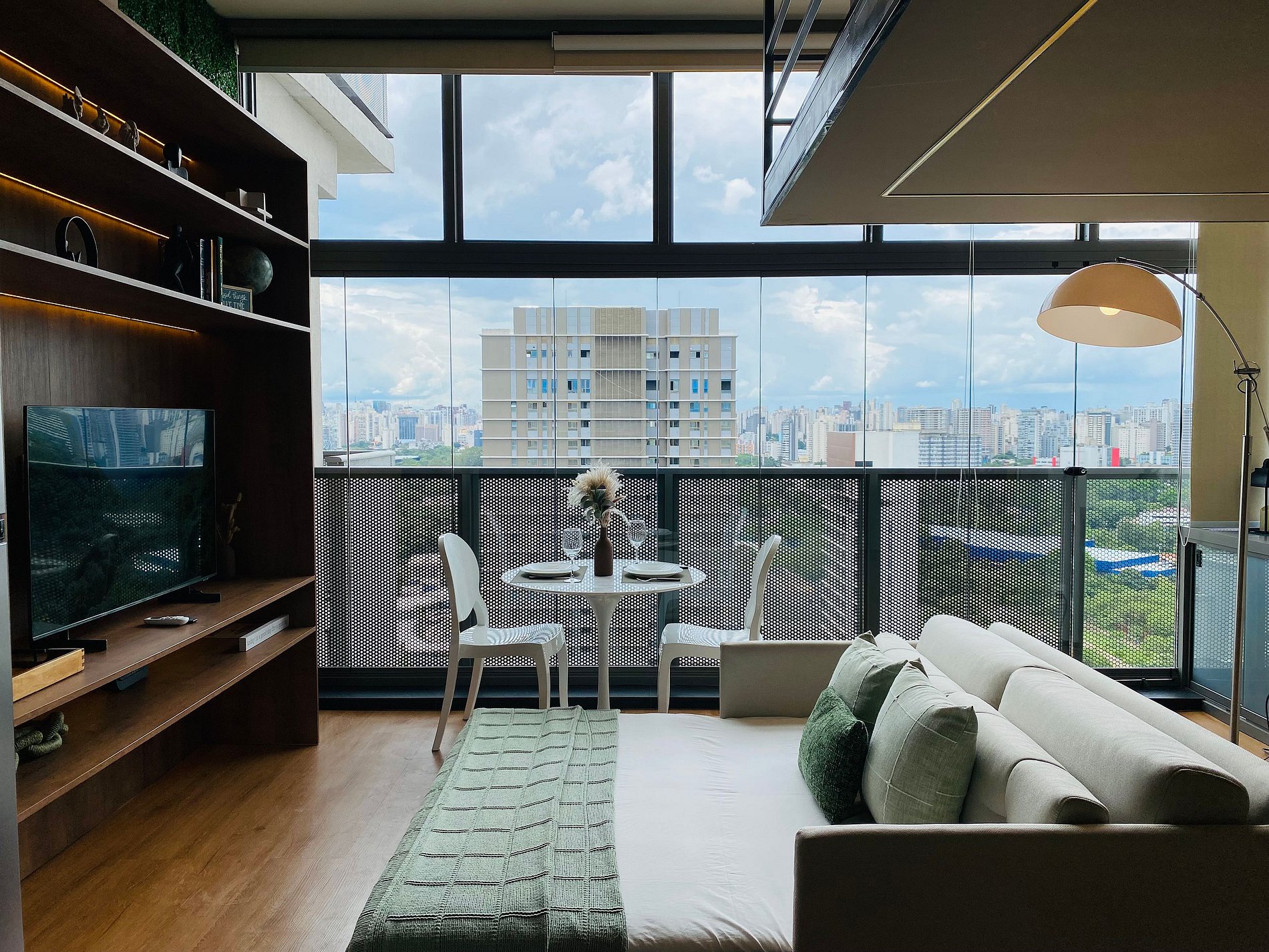 Apartamento com Cama queen e Sofá, Armário com cabideiro, Ar condicionado split e sacada. Ambiente confortável com Smart TV de 50’, Wi-fi de 300Mbps; Cozinha com Geladeira duplex, Fogão, Micro-ondas, Cafeteira, Liquidificador, Sanduicheira, Louça, Panelas e Purificador de água; Banheiro com Água aquecida e Toalhas de banho macias.